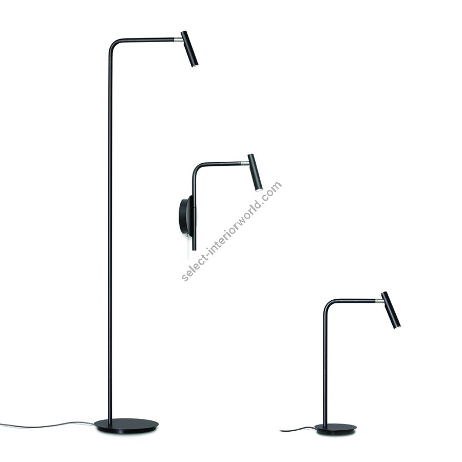 As said, MINISPOT comes in three models: floor lamp, wall (its arm can move 180 degrees) and table lamp. The structures are made of iron painted in textured white or black, although upon request and for a large project, they can be painted in any finish. The light source is an integrated Cree 3W 3000K 260lm LED with a 30º light beam, which is dimmable in the case of the table and floor, and on-off in the case of the wall light. As for the switches, it has a touch/dimmer in the table and floor versions, and a toggle switch in the case of the wall lamp.