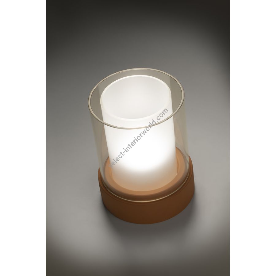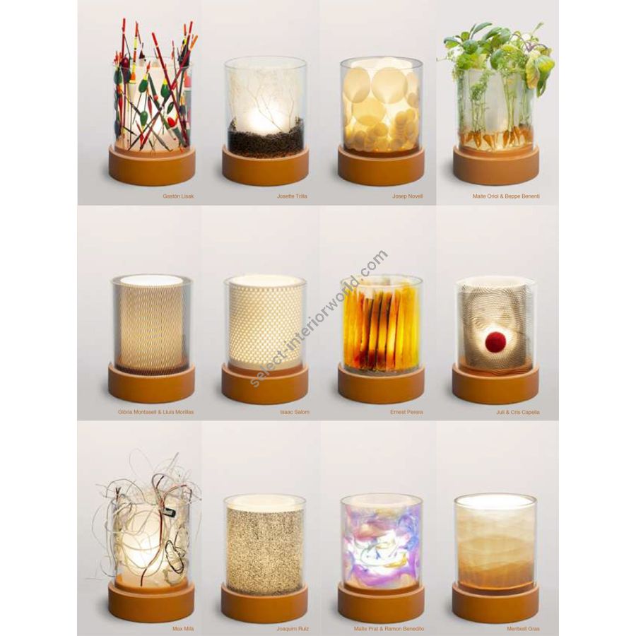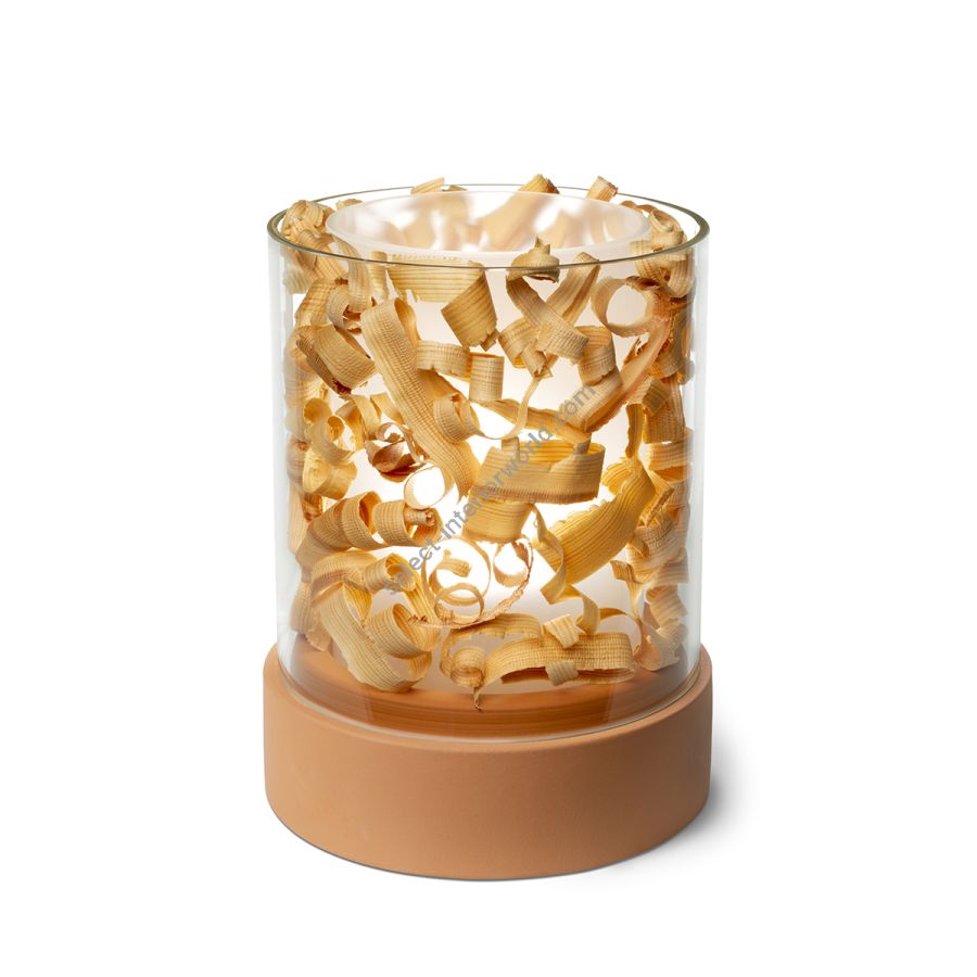 The POTLIGHT collection has only one model, and ALMA Light always supplies it with two fillings that are included in its packaging: one with beautiful wood shavings and the other with a nice handmade paper. Then each user can utilize those fillers, or others, or none at all. The base is ceramic/clay with a diameter of 21cm and the total height is 26cm. The double shade is composed of two borosilicate glass cylinders: a transparent outer glass and a sandblasted, more opaque, inner glass. POTLIGHT includes an E27 lamp holder, so light temperature and power are up to what the user decides when choosing a bulb. It has a cable with on-off switch, without a dimmer.