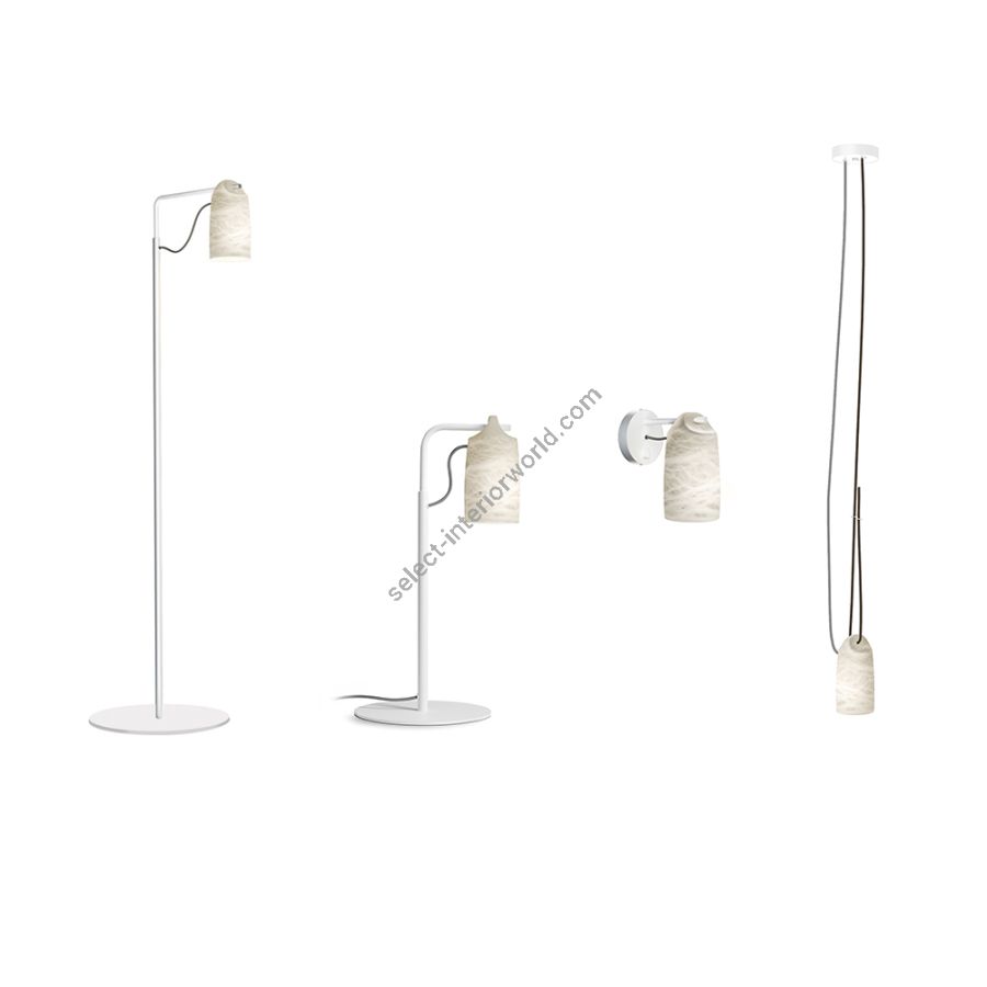 The PAROS ALABASTER collection consists of four models: floor, table, wall and hanging lamp. The structure is painted white textured iron, and the shade is of polished alabaster. All versions include E14 sockets and the light source is not included, allowing the end user to choose, of all the bulbs on the market, the one which intensity and temperature of light they prefer, either traditional (max.20W) or LED.