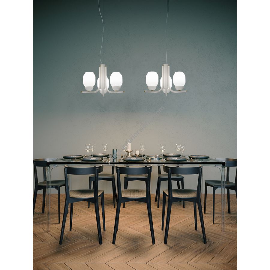 The shades of the THECHANDELIER collection are made of opal glass and can be smooth or grecale-style frosted. The structures are all made of electroplated iron in gloss polished brass finish, or textured painted white or black. The collection, however, is easily customizable in finishes, both metal and glass, to adapt to all types of projects. Inside each shade there is an E27 socket, which will allow the end user to choose the bulbs that best suit their wishes in terms of light temperature, intensity and possibility of dimming.