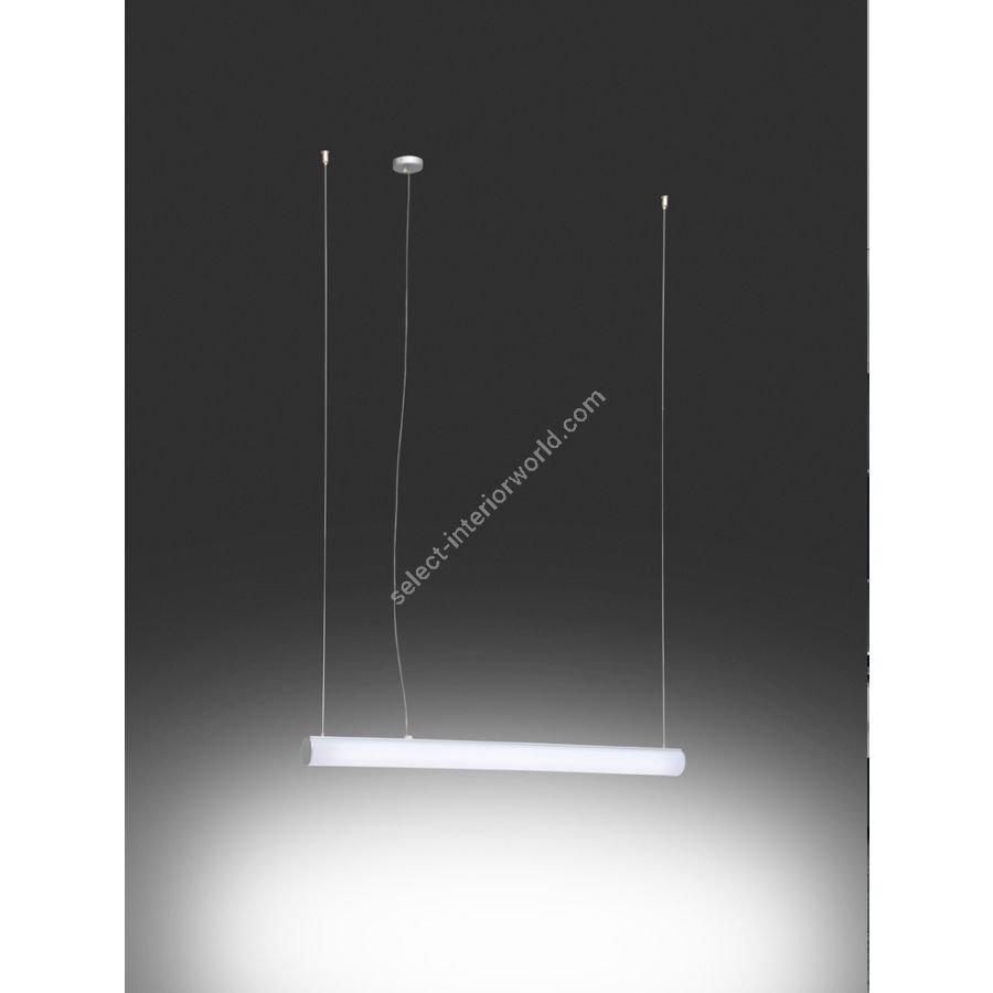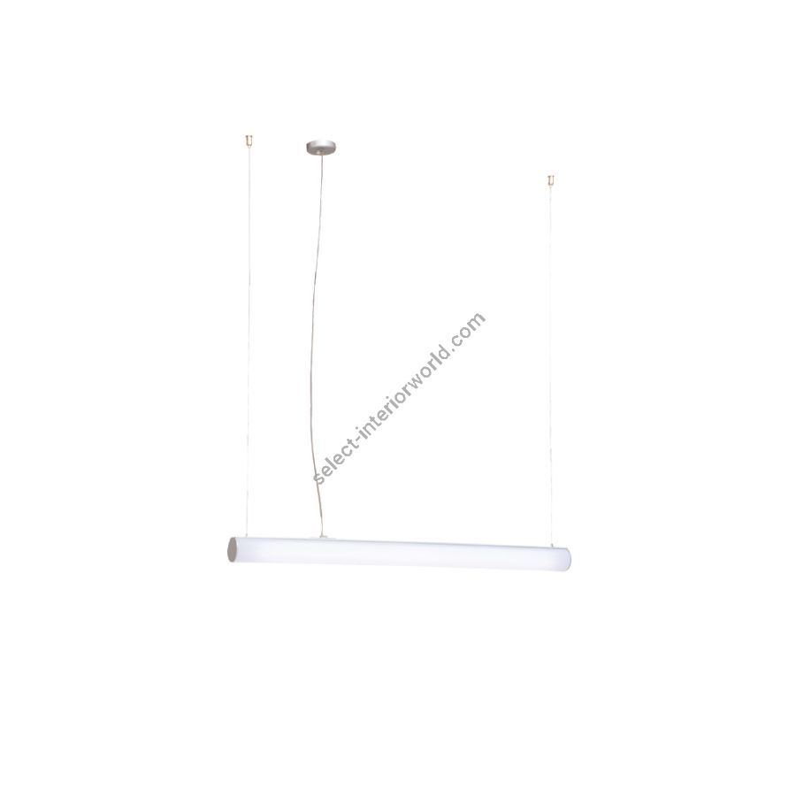 The collection has two models, which, in reality, are three in practice: one that serves as both a ceiling lamp and as a sconce, and the other is a pendant. The cylindrical shade has a diameter of 8cm, is made of opal polycarbonate and is available in three lengths: 60, 90 and 120cm. The structure is made of textured painted iron in two finishes to choose: white and silver. The light source is an integrated LED strip 230V 2700K CRI>80 dimmable by TRIAC, with power and luminous performance depending on the length of the lamp: 14W 1350lm for the length of 60cm; 22W 2160lm for 90cm and 30,8W 2970lm for the one of 120cm.
