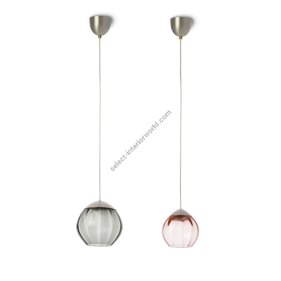 The SOFT collection is made up of 3 models: a single pendant, a pendant with a linear canopy and 4 lights, and a pendant with a round canopy and 5 lights. The structures are made of iron in two finishes: satin nickel-plated or painted in textured white. The pendants of 4 and 5 lights combine the 2 sizes of glass (12cm or 16cm diam.), to choose between pink and black for the nickel structures, or white for the white structures. The driver is included, housed inside the canopy. The light sources are Seoul 4.5W 372lm 2700K CRI>80 integrated LEDs, not dimmable.