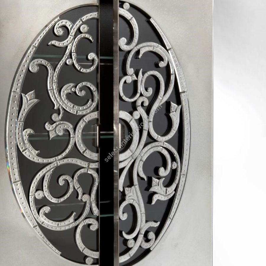 Doors, sides and back made of glass with medium antique mirrored finish. Oval-shaped fretwork decor in the centre made of transparent glass and bevelled and engraved glass with medium antique mirrored finish.