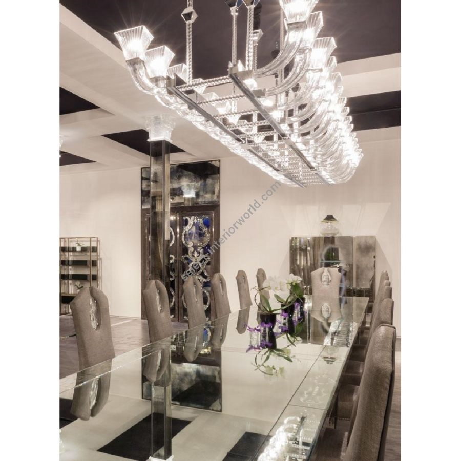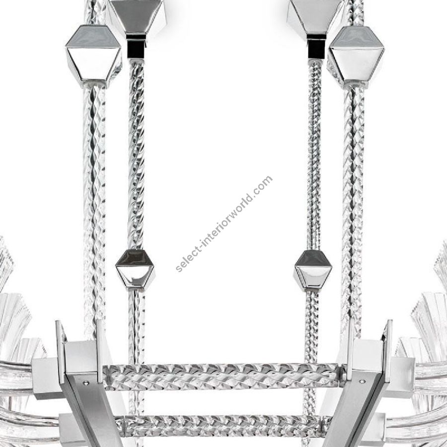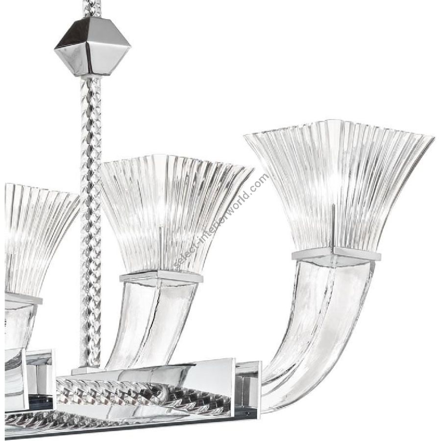 Metal structure with chrome and shiny finish. Tapered crystal coloured cast glass cups. Curved squared-shaped arms.