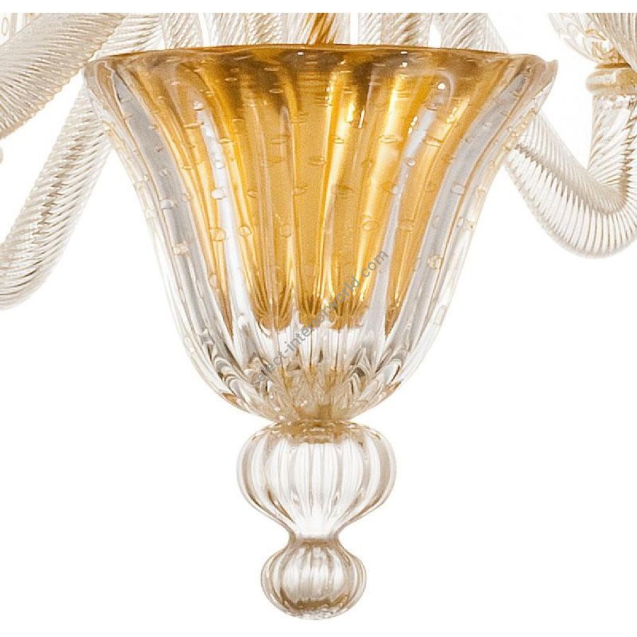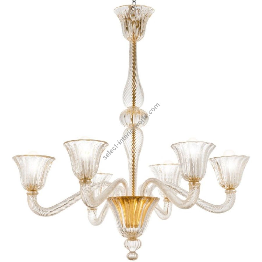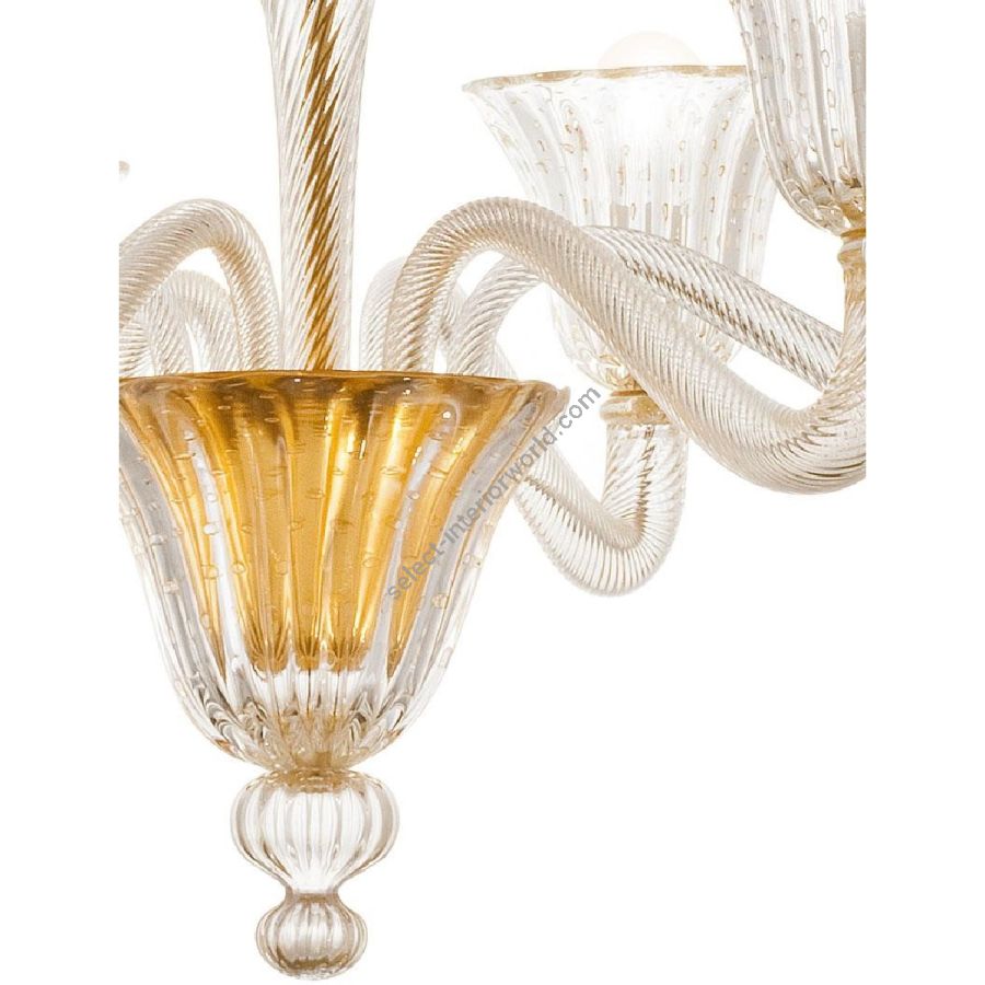 Metal structure with golden brass finish. Cups and curved arms made of crystal and gold coloured “torchon” style Murano glass, with six lights.