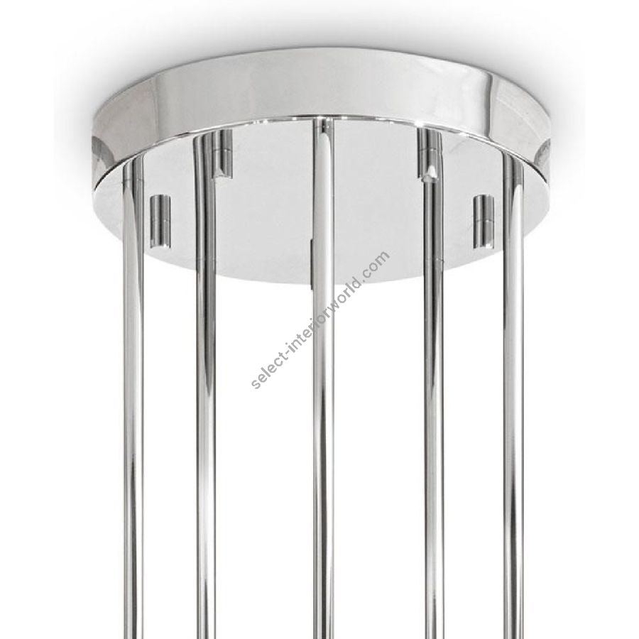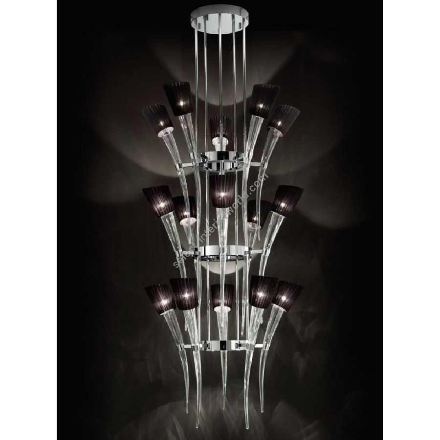 Cylindrical metal structure with shiny chrome finish. Conic-shaped and curved crystal coloured striped Murano glass arms.