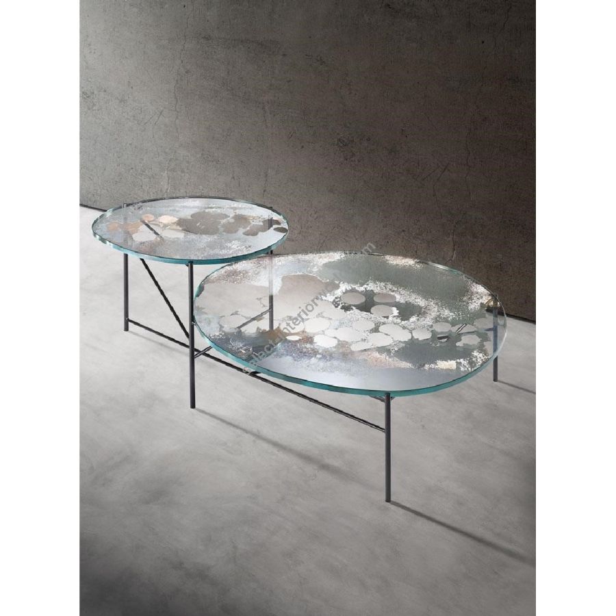 Metal structure with black matte finish. Two different oval-shaped top made of glass with medium antique mirrored finish and partially transparent according to a spotted artistic motif.