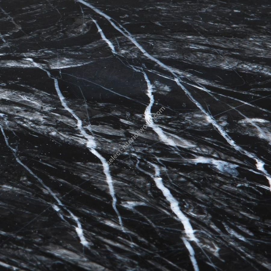 Coffee table made of shiny black lacquered wooden structure. Not antiqued and hand engraved mirror. Marquinia marble top. Feet in “gun-barrel” satin brass.