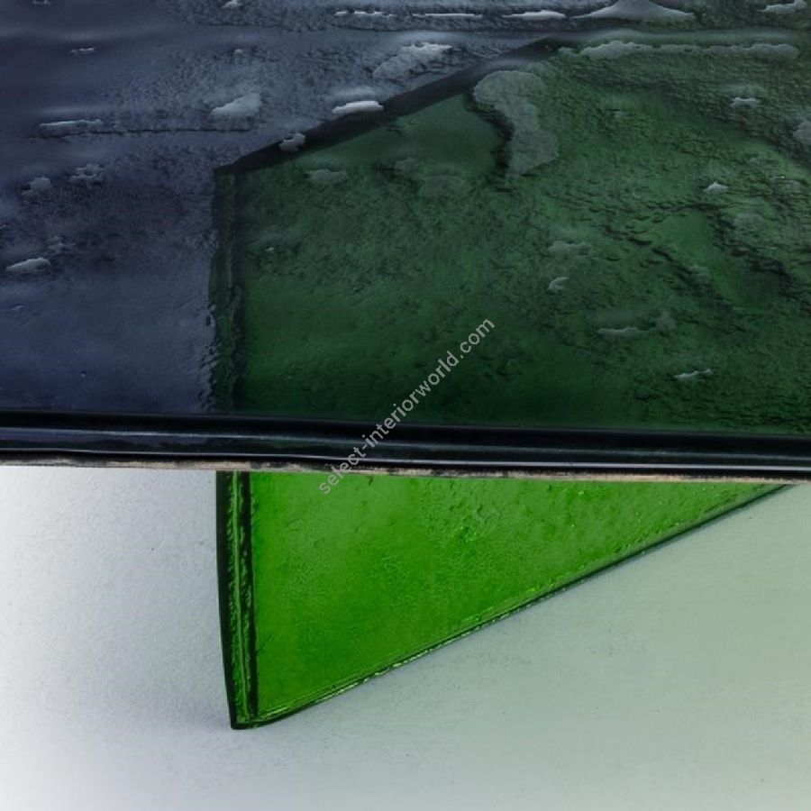 Top and legs in baked glass in two layers with irregular edges. The entire piece is varnished in gradation from green to midnight blue, with partial silvering on the back.