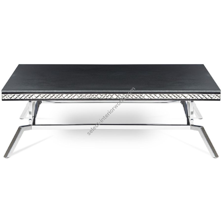 Coffee table with top in antiqued Black Absolute marble and inserts in extraclear mirror with handmade shiny bevellings. Base in shiny stainless steel.