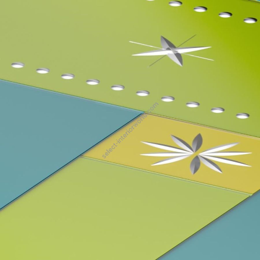 London grey and/or acid green lacquered plywood structure. Top with extra-clear acid etched 6 mm thick glass varnished in multicolour and decorated with silver hand engravings.