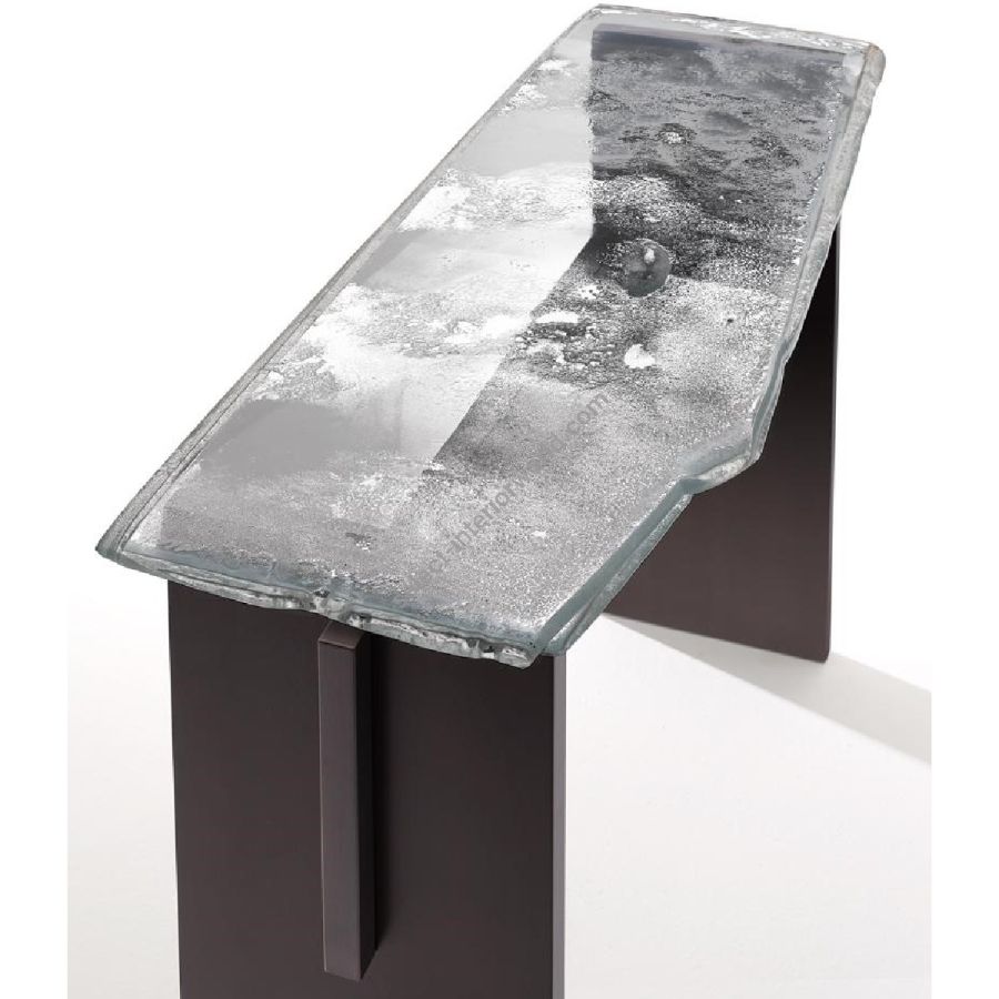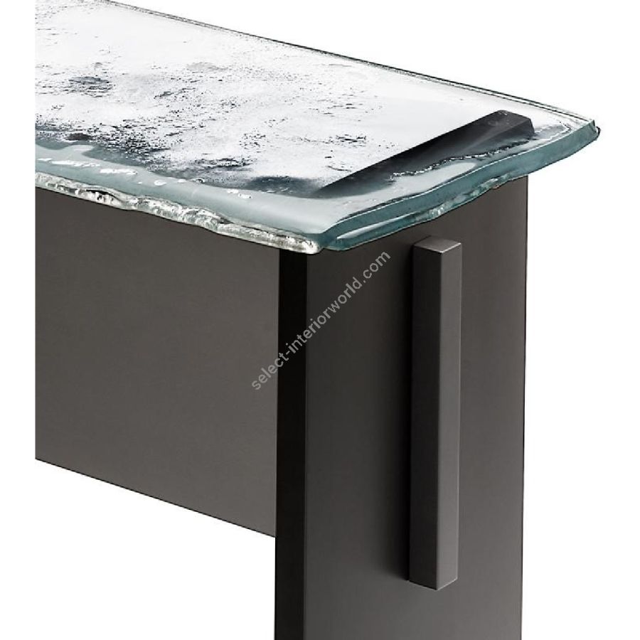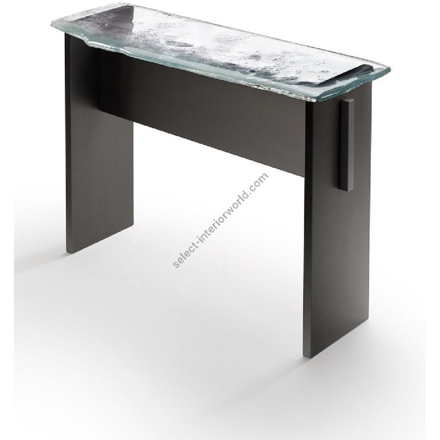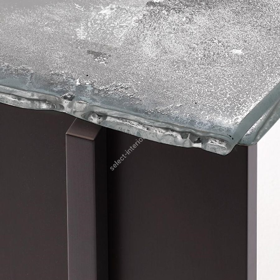 The top is made of two layers of mirrored baked glass with uneven borders. Matte black lacquered with a multilayer wooden structure.