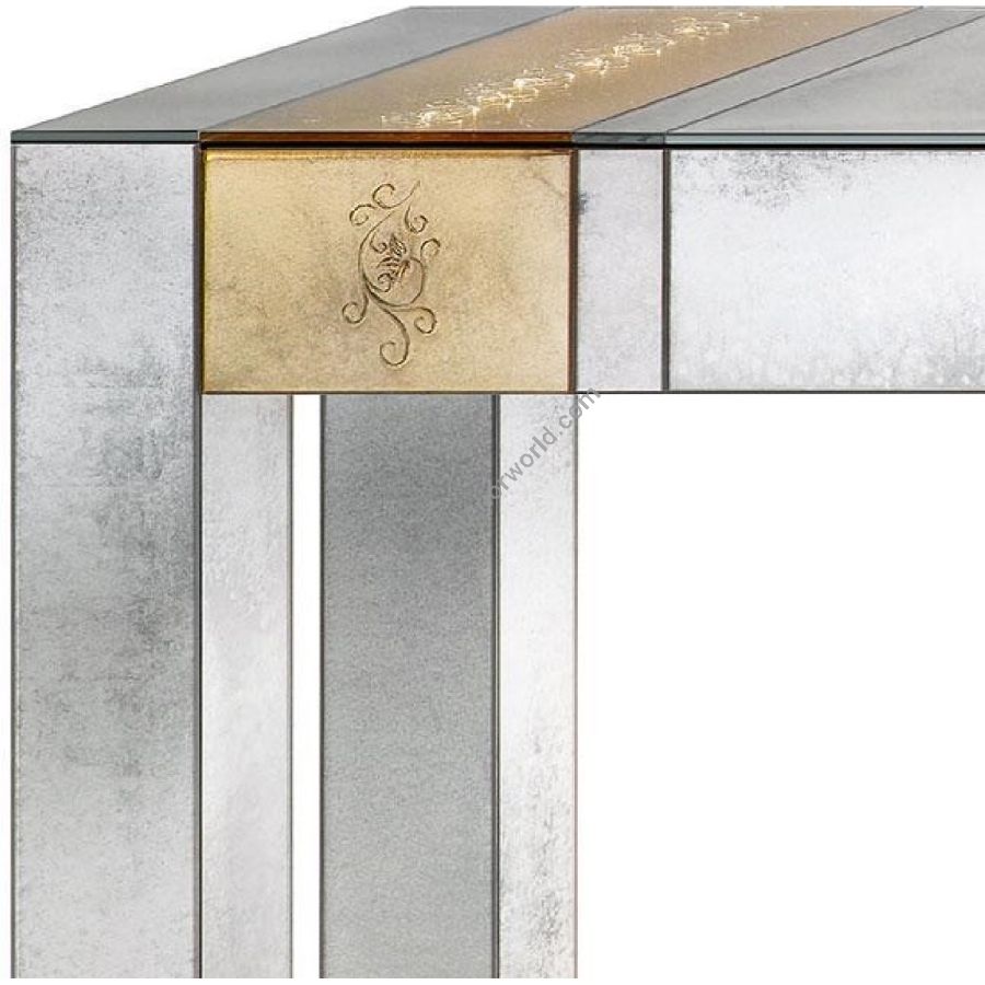 Handmade console table with bands in antiqued mirror and multicoloured glass with floral handmade engravings.