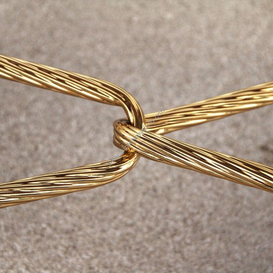 Structure made of wood with gold leafed and heavy antique finish. Four shaped legs joined together with a shiny gold coloured brass rope.