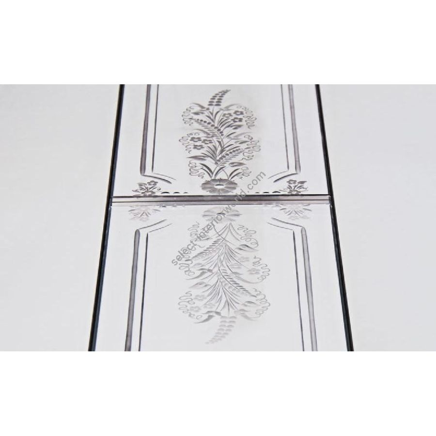 Central part of the top made of medium antique mirrored glass. Frames made of bevelled and engraved glass with medium antique mirrored finish.