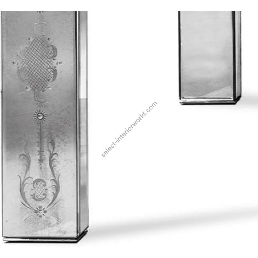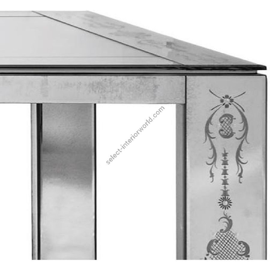 Venetian style table in hand engraved and antiqued extra-clear mirror. Structure in solid wood with shiny stainless steel details. Design Matteo Fossa.