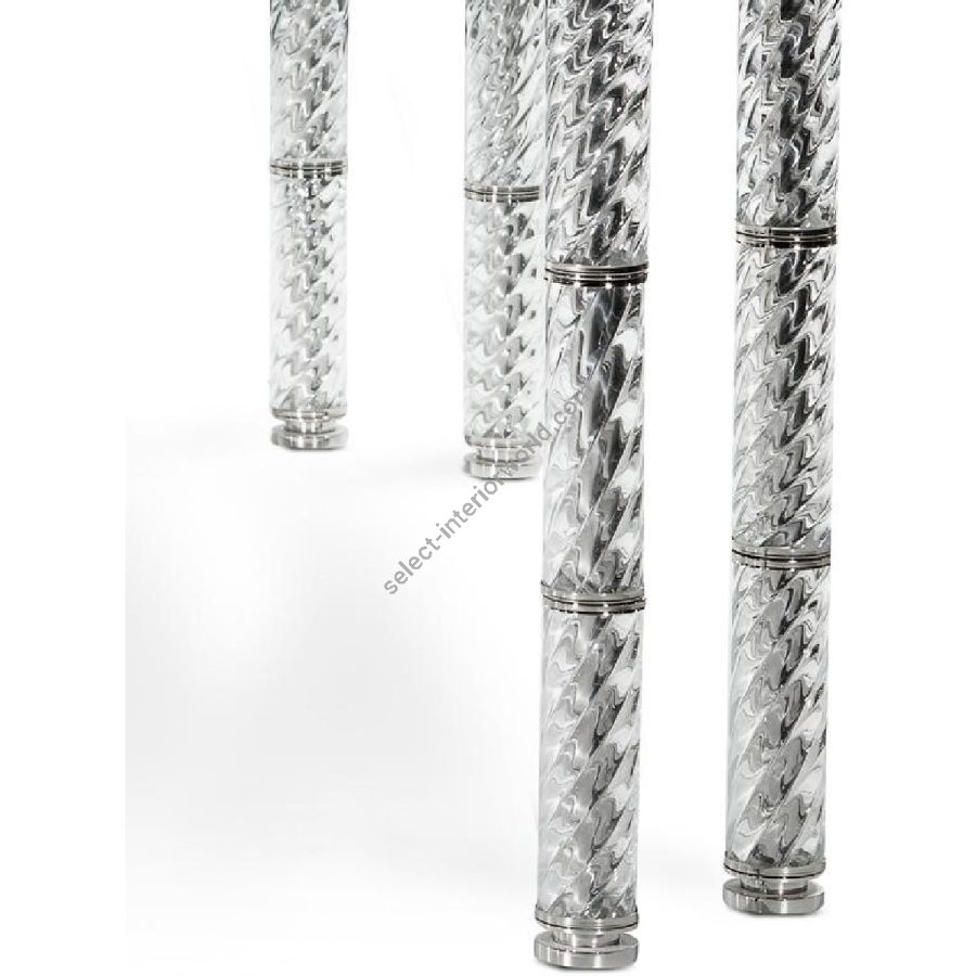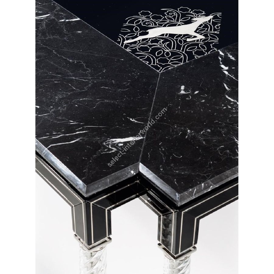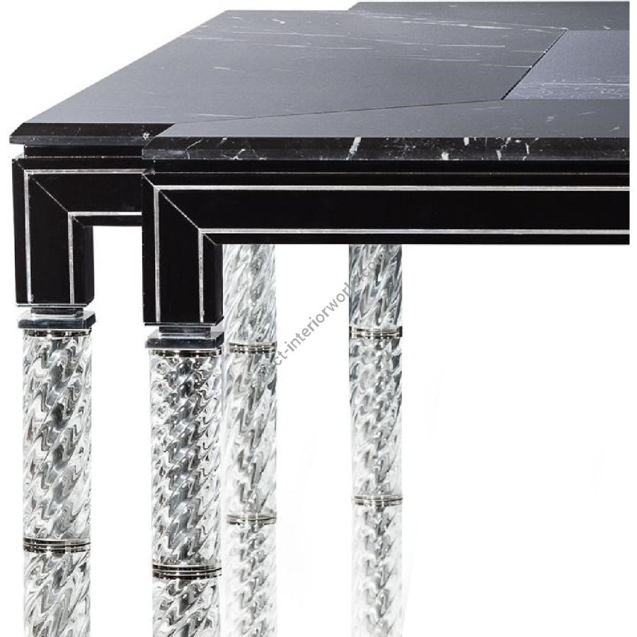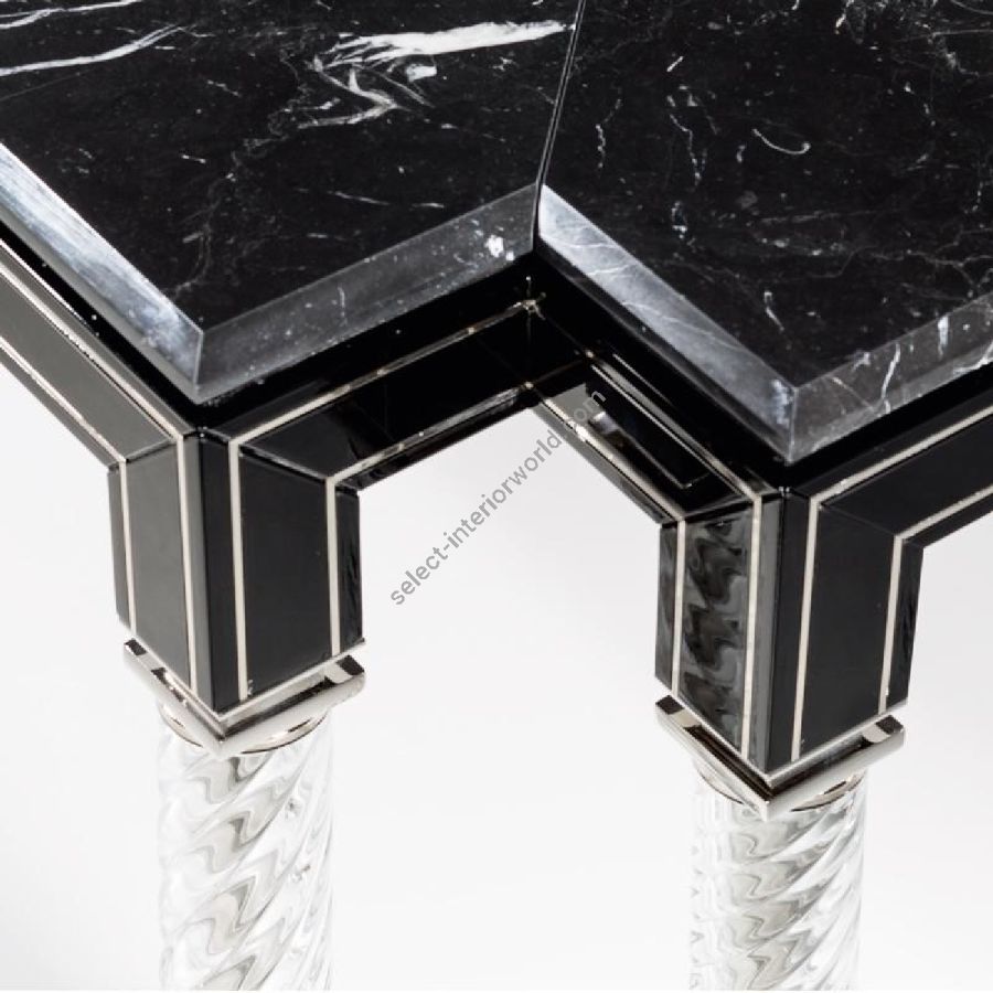 Table in shiny black lacquered wood with details in chromed brass. Top in black Marquina marble and black glass with silvered engravings. Legs in crystal colour torchon glass.