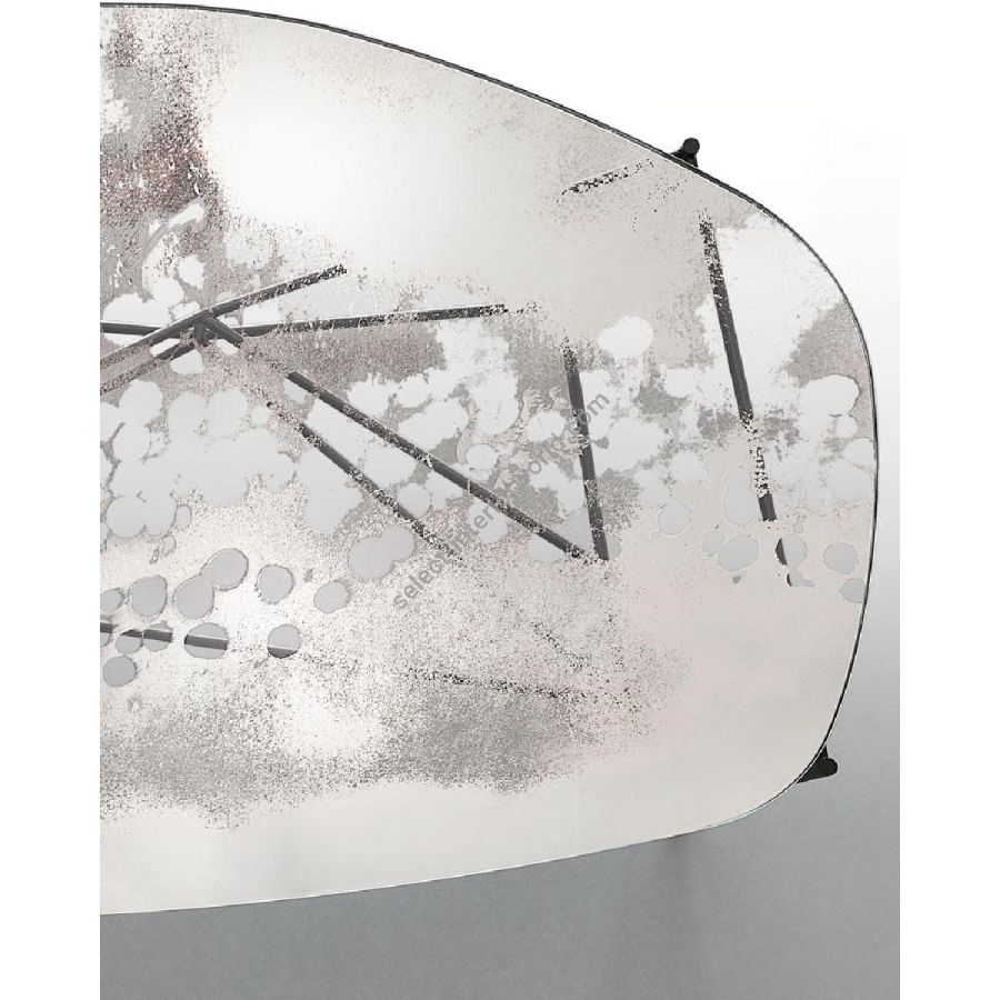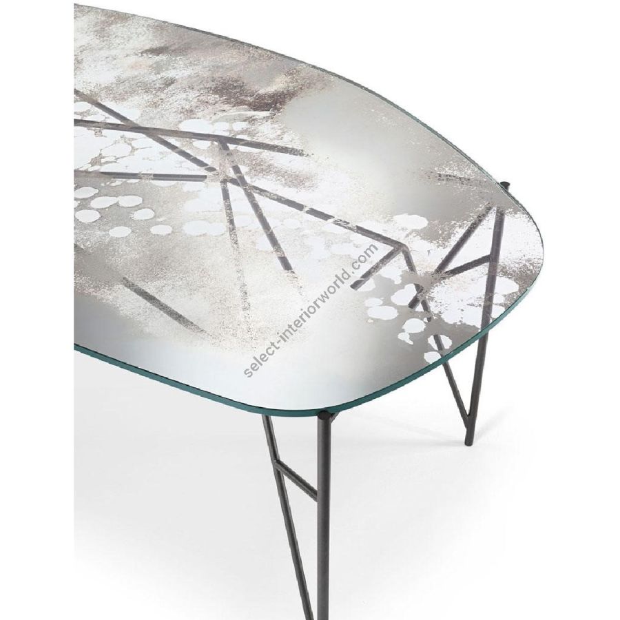 Metal structure with black matte finish. Oval-shaped top made of glass with medium antique mirrored finish and partially transparent according to a spotted artistic motif.