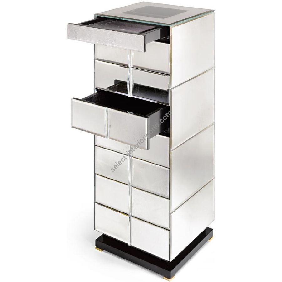 Chest of drawers in antiqued mirror and handles in extraclear glass, top in transparent glass with a tray covered in ray-fish leather. Interior in shiny black lacquered wood.