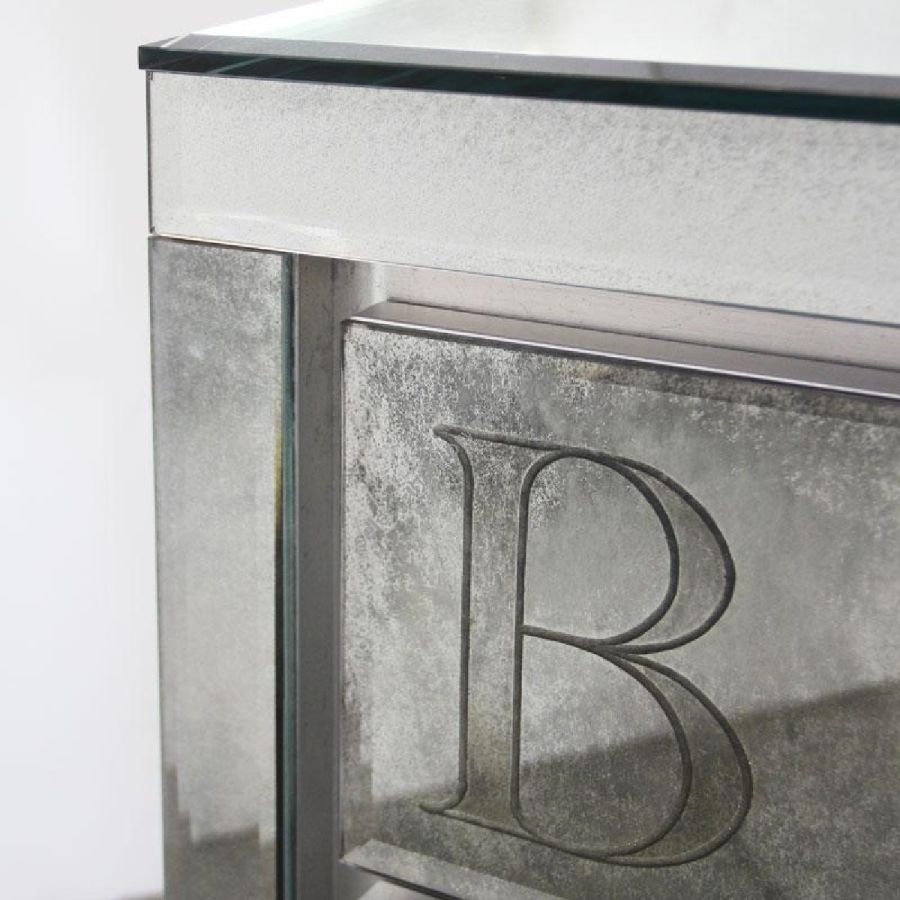 Structure made of fir wood with black finish and perimetral edges with silver leafed finish. Three drawers with soft-close system and interior made of beige velvet. Top and sides made of medium antique mirrored glass. Back made of wood. Drawers made of bevelled and engraved glass with medium antique mirrored finish.