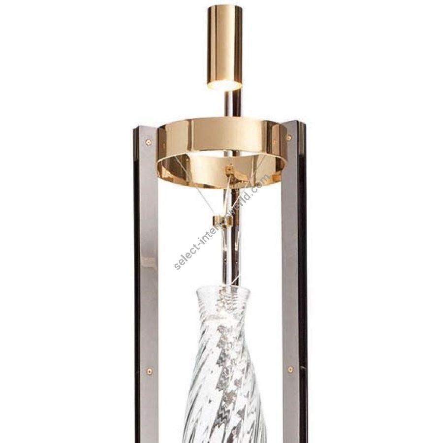 Floor lamp made of a black shiny nickel colour metallic structure and golden details.