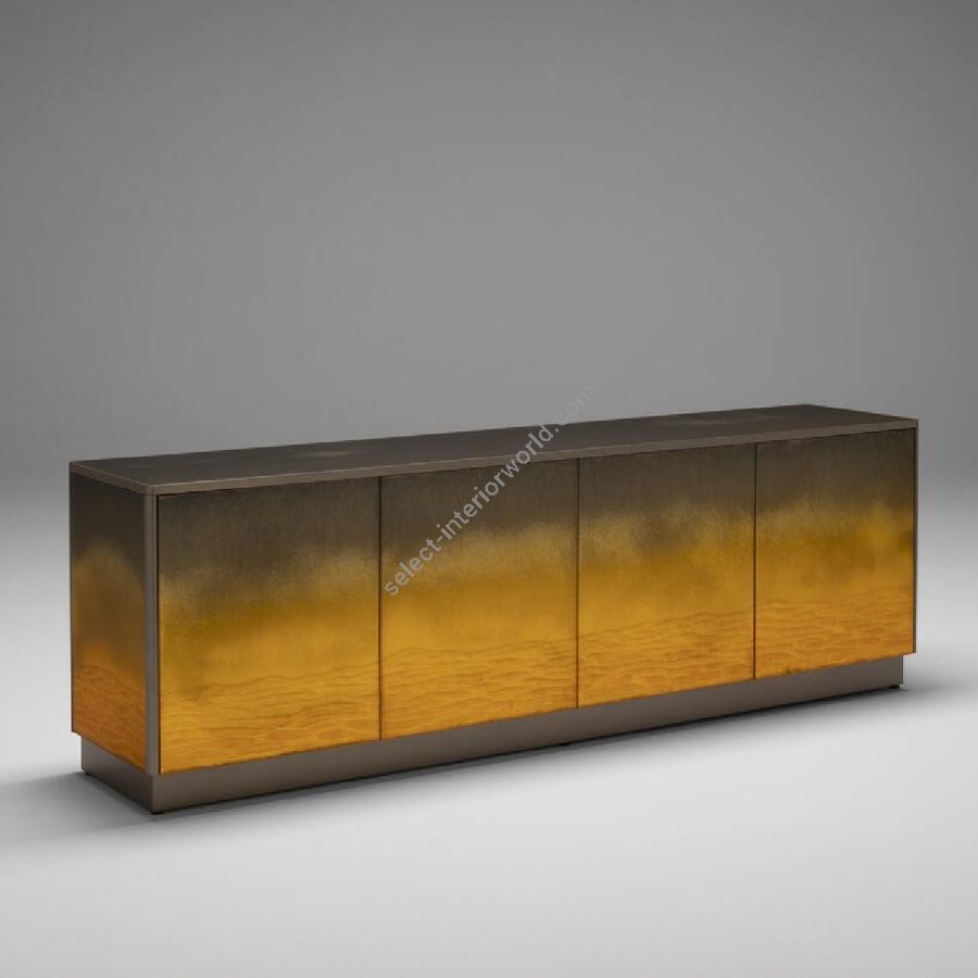 Sideboard in Gargano finish coating on etched glass. Baseboard and external edges in wood varnished with burnished brass finish, inside finish in brushed oak.