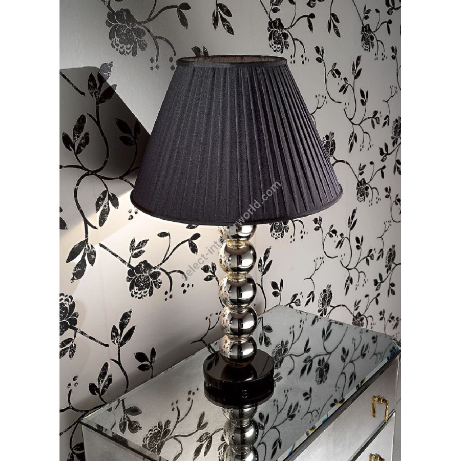 Art Déco Table Lamp with one light. Base in shiny black lacquered wood and silvered spheres. Lampshade in black pleated fabric.