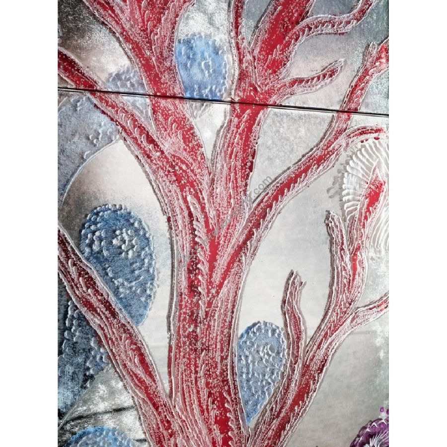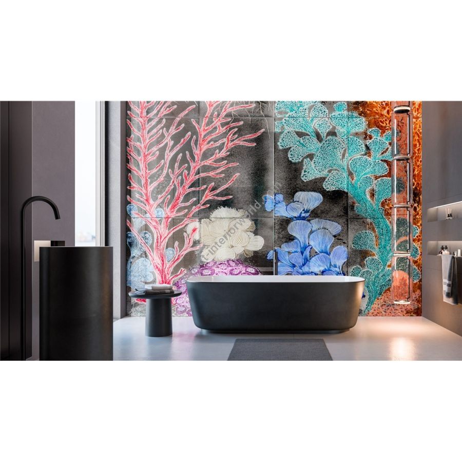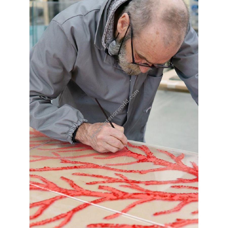 The protagonist of Posidonia is a seabed made with a pen engraving technique with a diamond ball. Algae, corals and anemones are then painted and shaded by hand, while the effect of the ocean depth is obtained by silvering the wall by hand with rare craftsmanship. Each glass panel is pen etched both on the surface and on the back, it is then hand painted and only in the final stage it is silvered with a heavy antique finish.