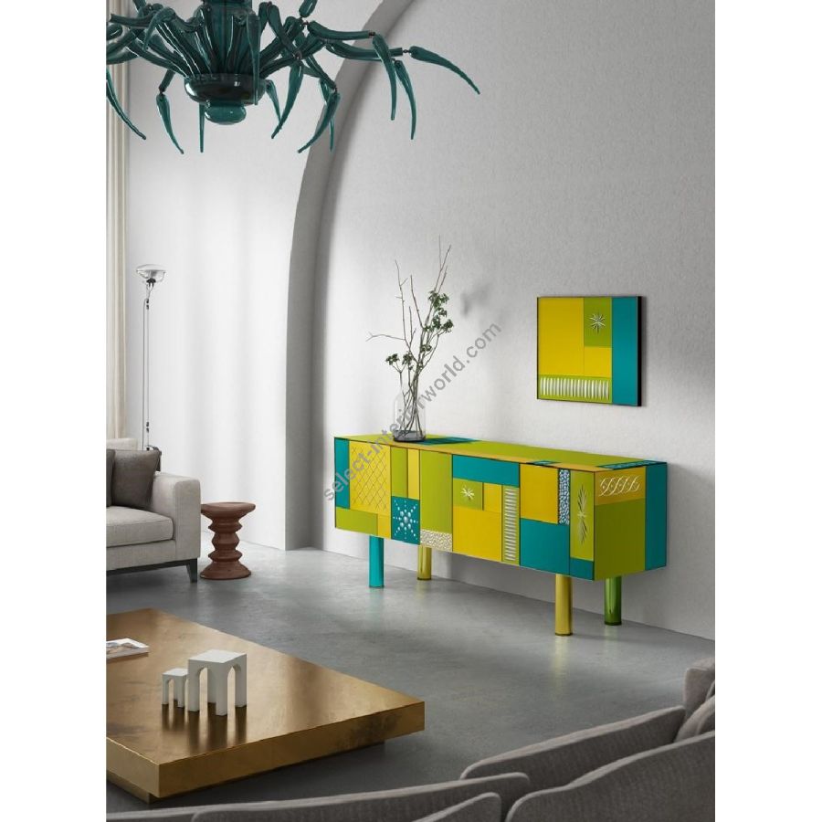 Discover the designed by Leo De Carlo in perfect harmony with the finishing.Extra-clear acid etched glass varnished in multicolour and decorated with silver hand engravings.