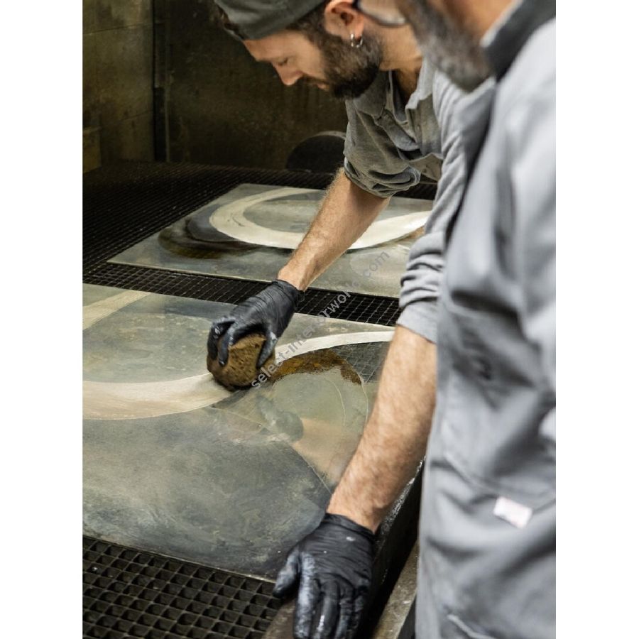 Extra-clear acid-etched glass panel. Hand-decoration in mixed technique (metal-leaf, engraving and enamel).