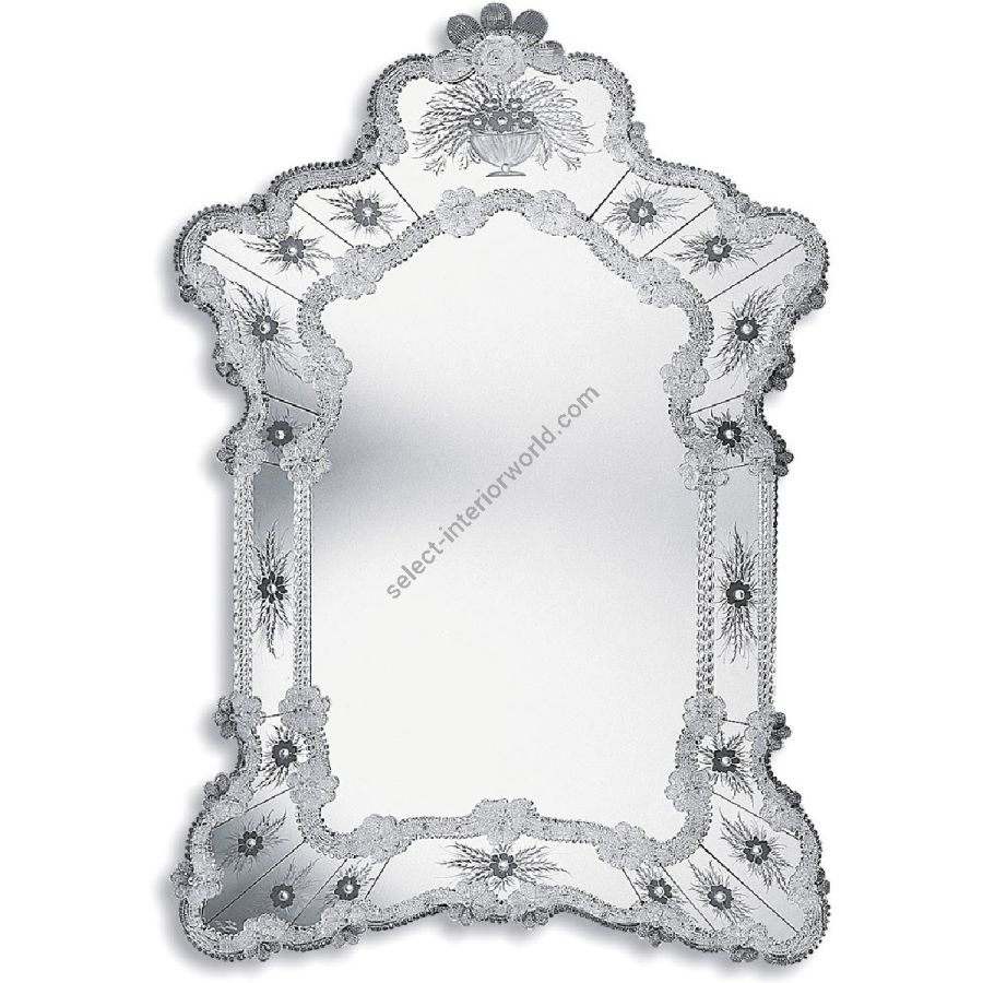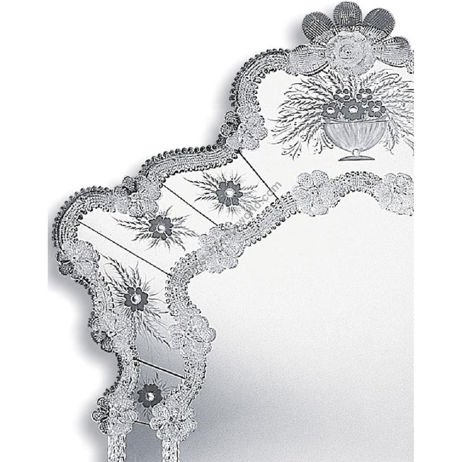 The most famous characters are the typical engraved curl finishings together with the depiction of Bacco, Justice or the well-known Venetian Eighteenth-century. Crystal colored Murano decorative flowers, leaves, twisted ropes and multicoloured glass paste rosettes embellish each Venetian mirror. The result is a unique item comparable to a work of art for craftsmanship and excellence in its execution.