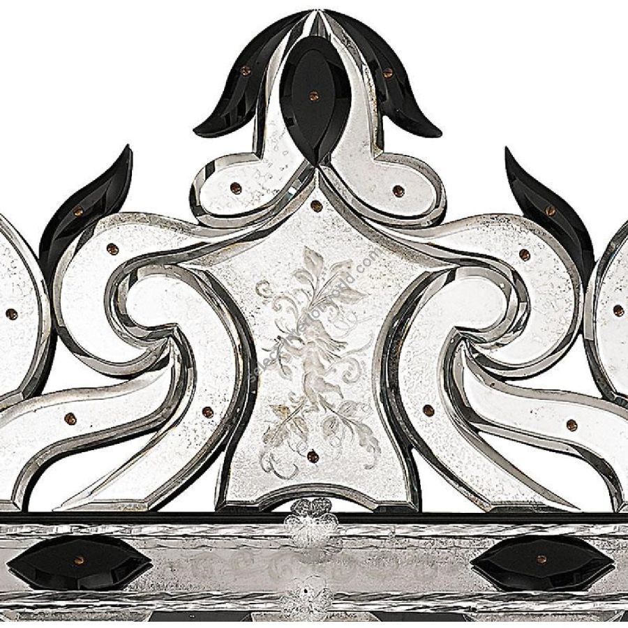Fretwork structure made of solid wood with black lacquered matte finish. Central part, crest, frames and engraved decorative tiles made of bevelled glass with medium antique mirrored finish.