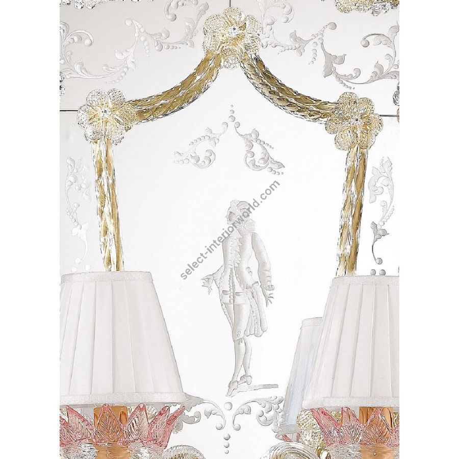 Floral motif and the depiction of Giacomo Casanova engravings. Decorative leaves, curls, rosettes and twisted ropes made of crystal and gold coloured Murano glass. Two lampshades made of white pleated fabric. Cups and main rosette made of pink coloured Murano glass.