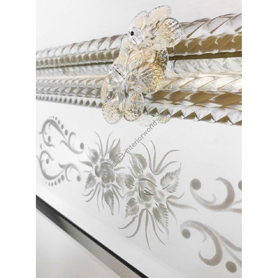 Last but not least: do not worry if the mirror's decorations seem badly fixed. Our master artisans preserve the historical tradition in avoiding fixing the glass parts. In fact leaving those parts mobile and tying them with an iron wire is the correct procedure both to respect Venetian roots and above all, to avoid damage and breakage of the glass.