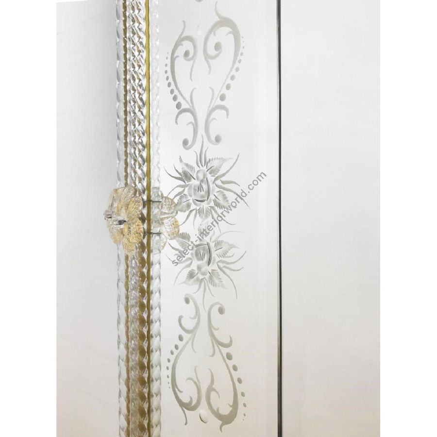 Floral motif engravings. Decorative leaves, rosettes and twisted ropes made of crystal and gold coloured Murano glass.