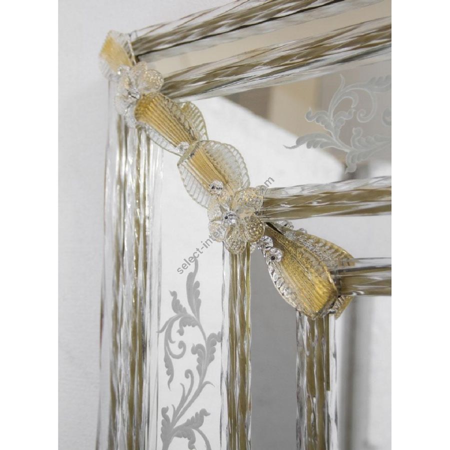 Floral motif engravings. Decorative leaves, rosettes and twisted ropes made of crystal and gold coloured Murano glass.
