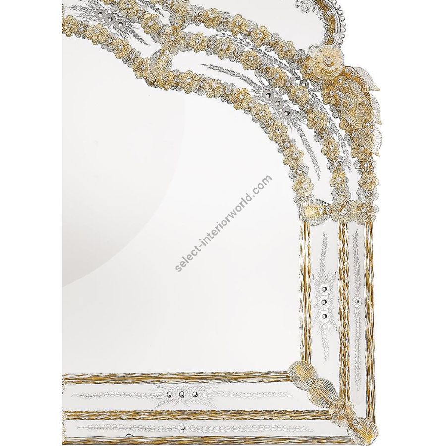 Floral motif engravings. Decorative curls, leaves, rosettes and twisted ropes made of crystal and gold coloured Murano glass.