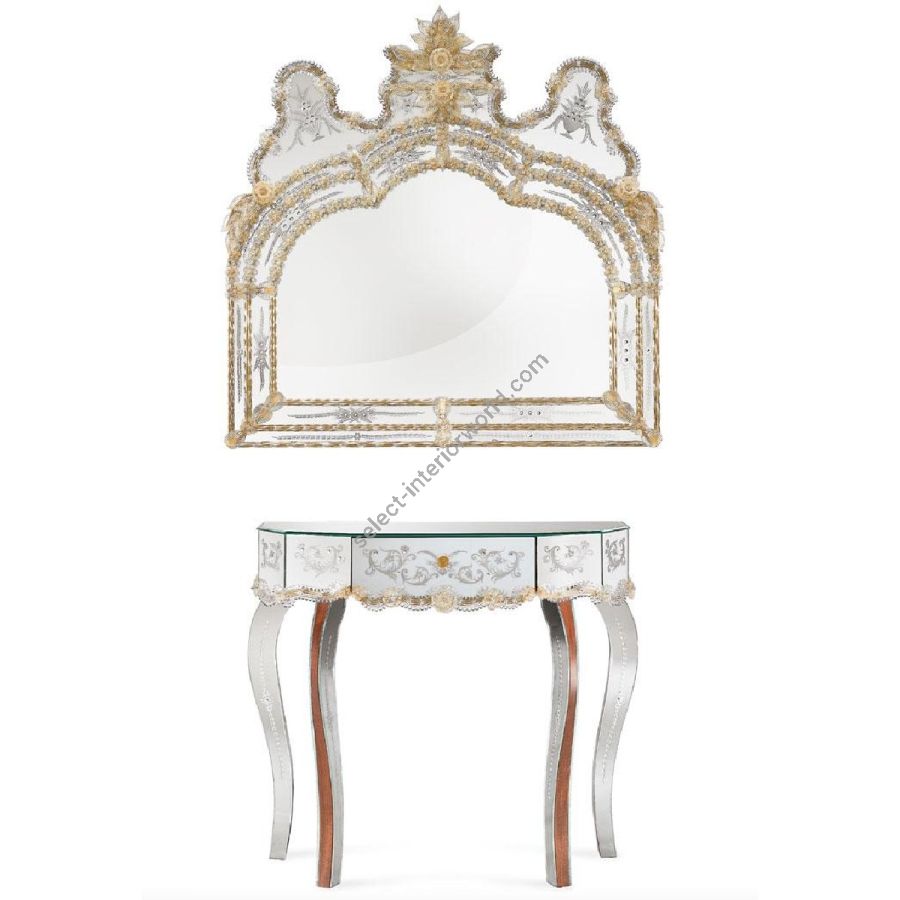 The most famous characters are the typical engraved curl finishings together with the depiction of Bacco, Justice or the well-know Venetian Eighteenth-century. Crystal colored Murano decorative flowers, leaves, twisted ropes and multicoloured glass paste rosettes embellish each Venetian mirror. The result is a unique item comparable to a work of art for craftsmanship and excellence in its execution.