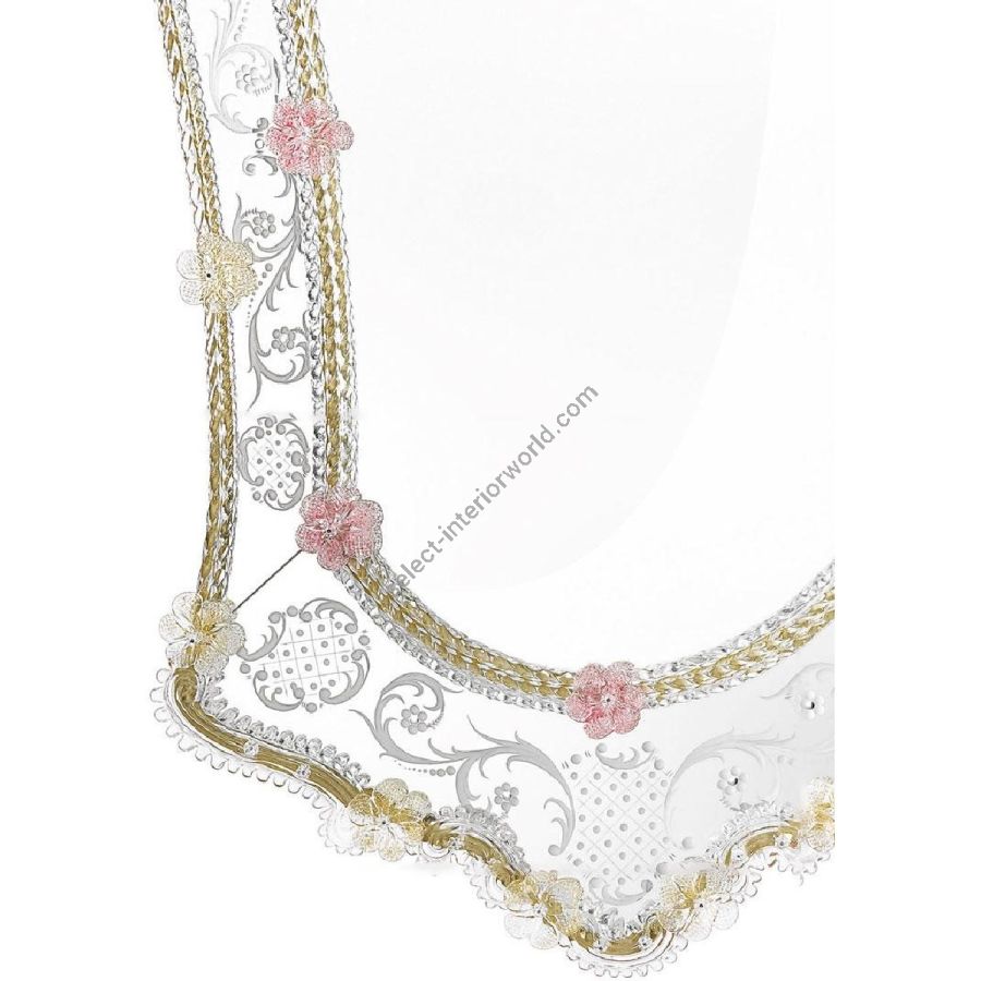Hand engraved Venetian style mirror with golden crystal Murano glass curls and blush pink flowers. Structure in natural wood.
