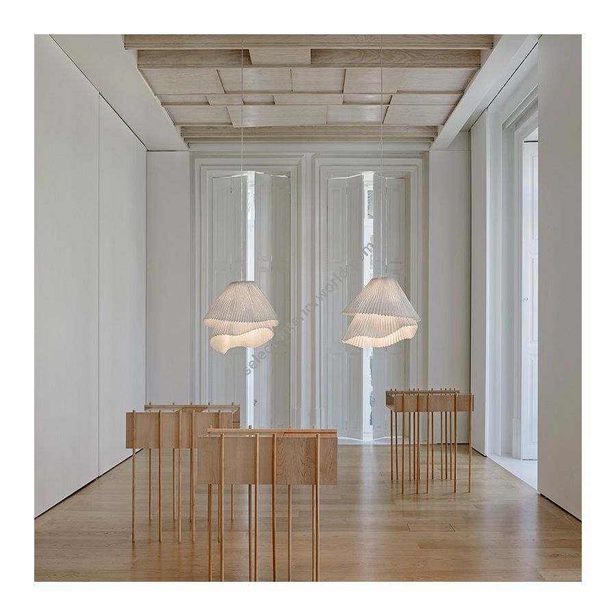 Tempo is a pendant lamp collection made with painted stainless steel mesh. This material, crafted in fine pleats, forms two overlapped layers that create two different lamps full of dynamism. Andante and Vivace, two liveliness shapes born from one. The representation of two instants generated by the same movement at a different tempo.