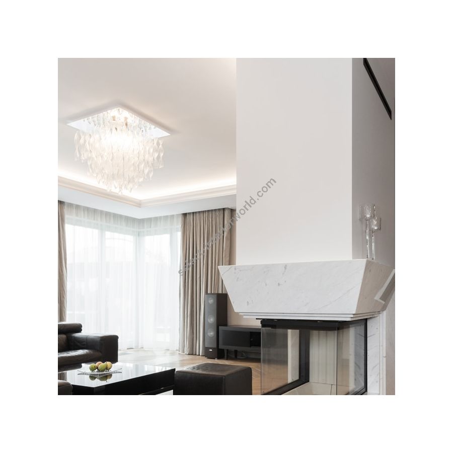 Masterful glass craftsmanship shines through in finely crafted pieces, meticulously assembled to create a fluid play of light and reflection. Blending tradition and design, each element exudes unique charm. Featuring suspensions, wall, and ceiling lamps, the Aura collection brings refined, timeless elegance to any space, where light takes center stage.