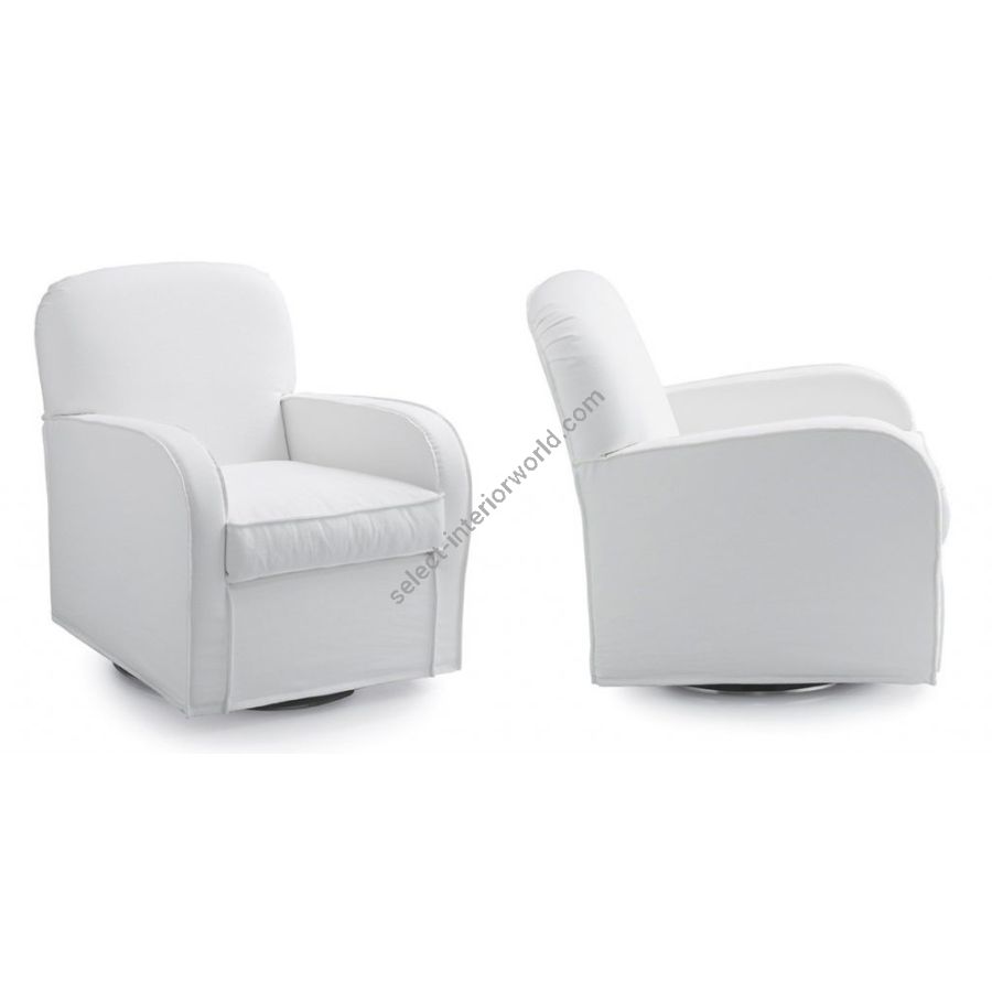 Compact dimensions and a cosy line for relaxing in comfort and total well-being, additionally equipped with a swivel base. The embossed stitching detail lends originality and elegant freshness.