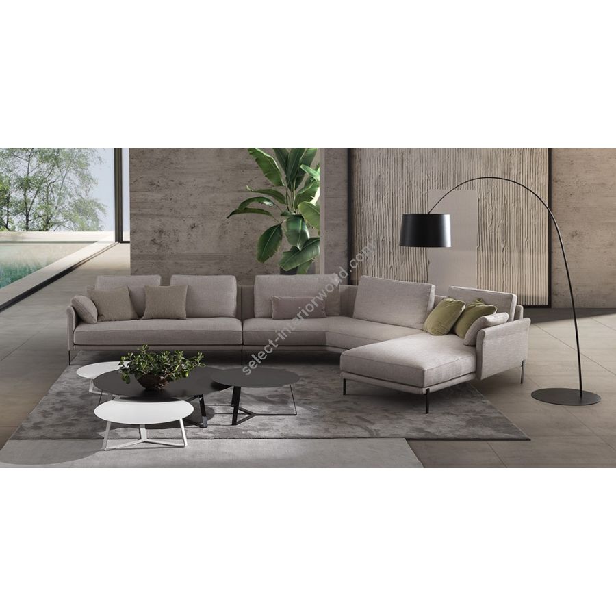 Babila consists of central and terminal elements, which come together sinuously to make even more new settings and combinations. It is characterized by a light air shell, lined with inviting cushions enhanced with hand made stitching, and by the choice of apparently slender but strongly structured foot.