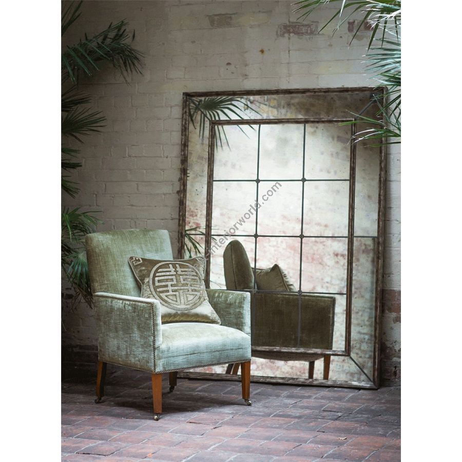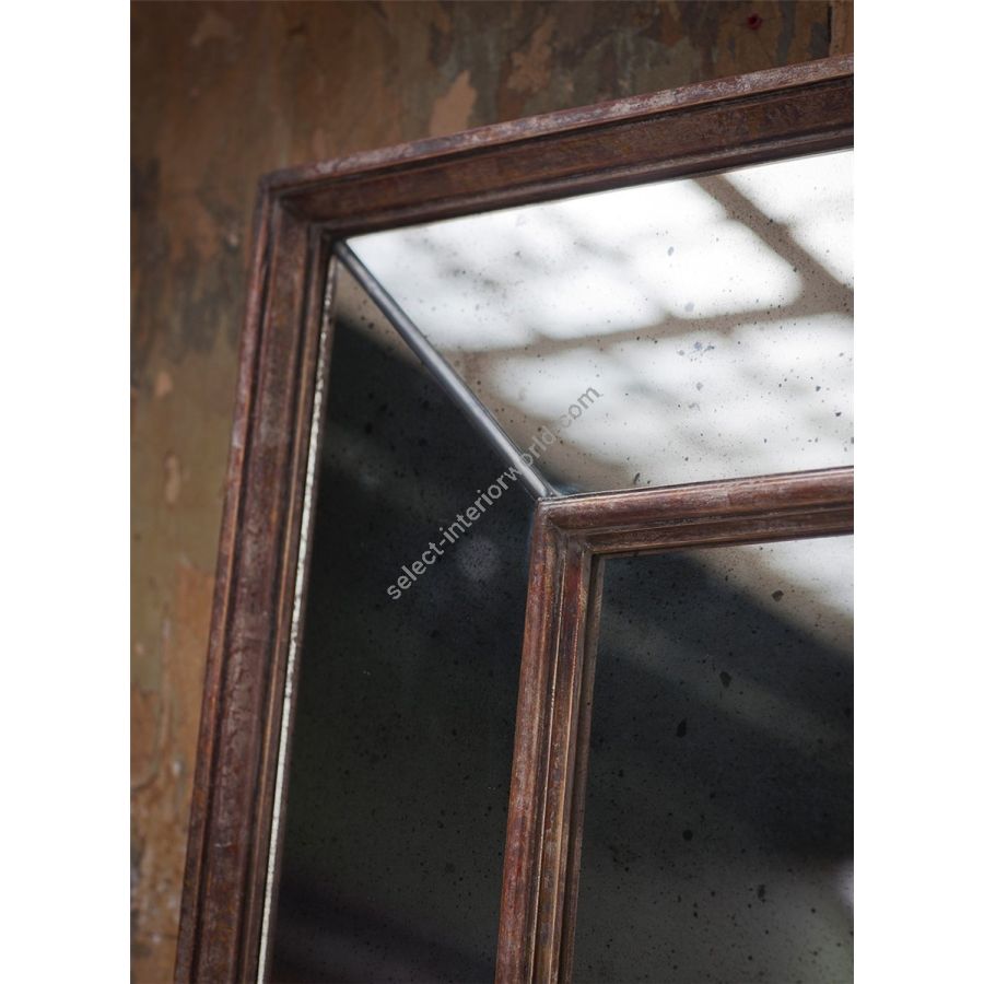 This large mirror is dramatic and striking. It contains small panels and an inner frame, giving it a strong architectural look.