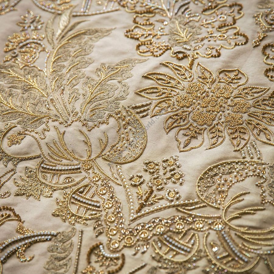 Our Couture fabrics are bespoke and hand embroidered to order. They can be created in fine gold or silver silk thread and embellished with freshwater pearls and semi-precious stones. Each pattern can be coloured and designed to fit your needs. We can embroider onto any background fabric including: silk, velvet, organza and leather.