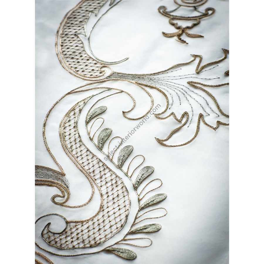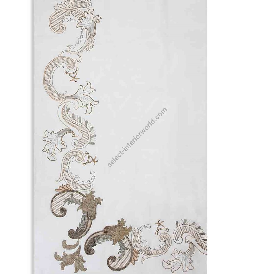 Silvia is a delicately embroidered leading edge pattern, featuring plant-based scroll decorations taken from Greco-Roman architecture.