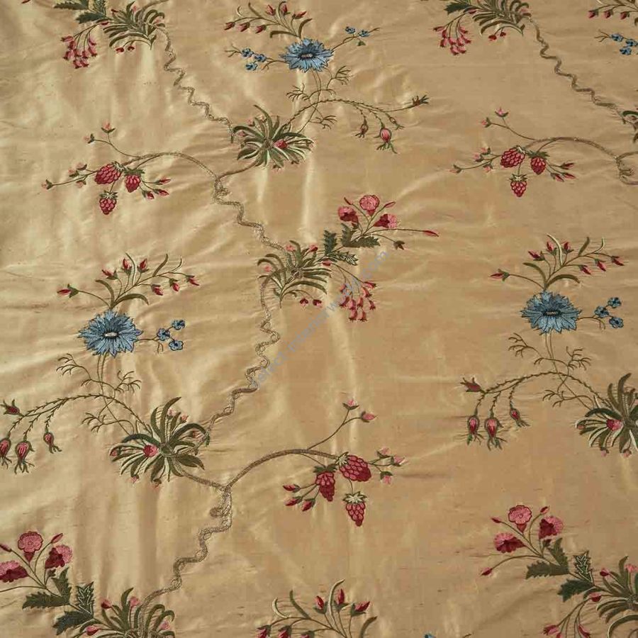 Spitalfields is an elegant Georgian design. It features richly coloured threads, with strands of antique silver, depicting intertwined cornflowers, rosehips, and wild strawberries.