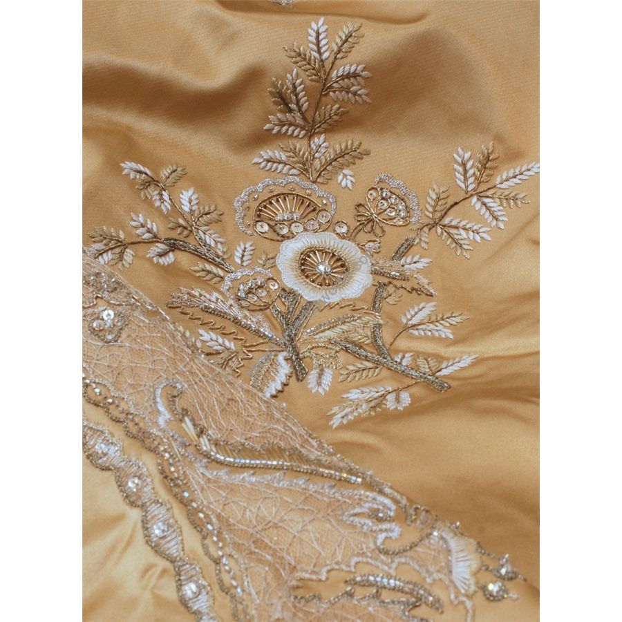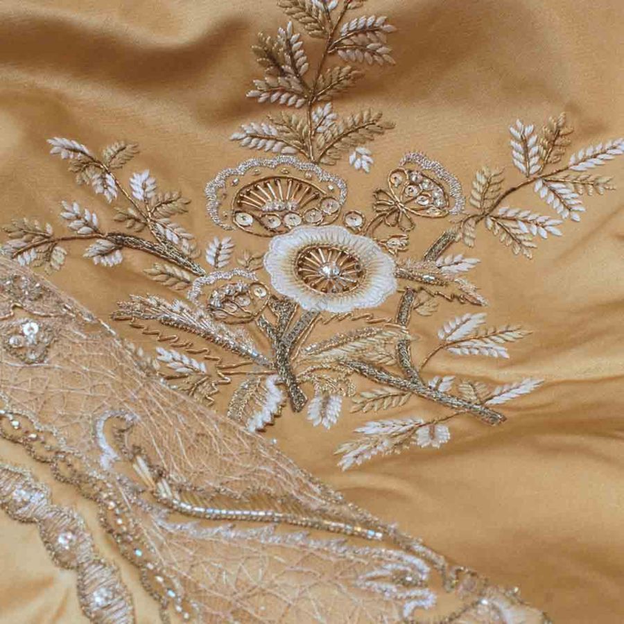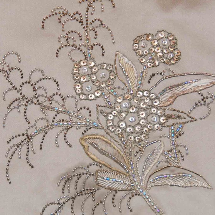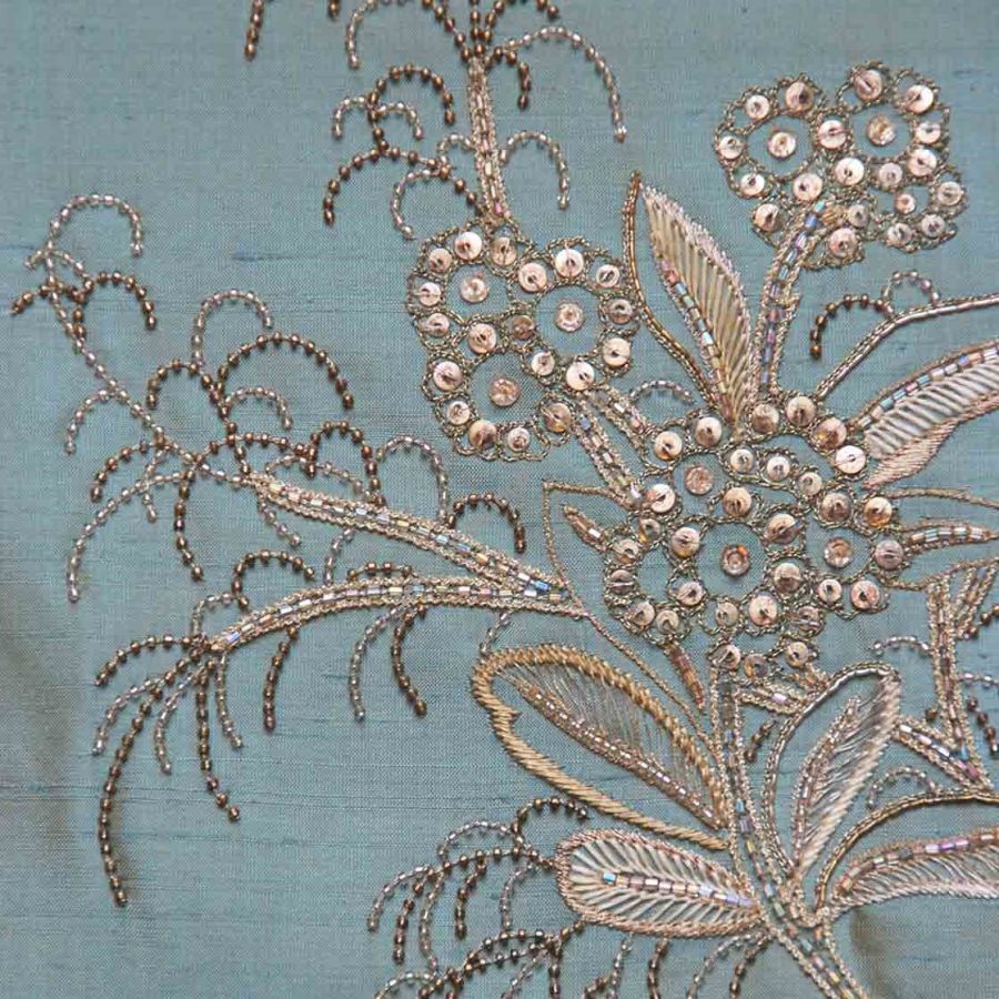 Our Couture fabrics are bespoke and hand embroidered to order. They can be created in fine gold or silver silk thread and embellished with freshwater pearls and semi-precious stones. Each pattern can be coloured and designed to fit your needs. We can embroider onto any background fabric including: silk, velvet, organza and leather.
