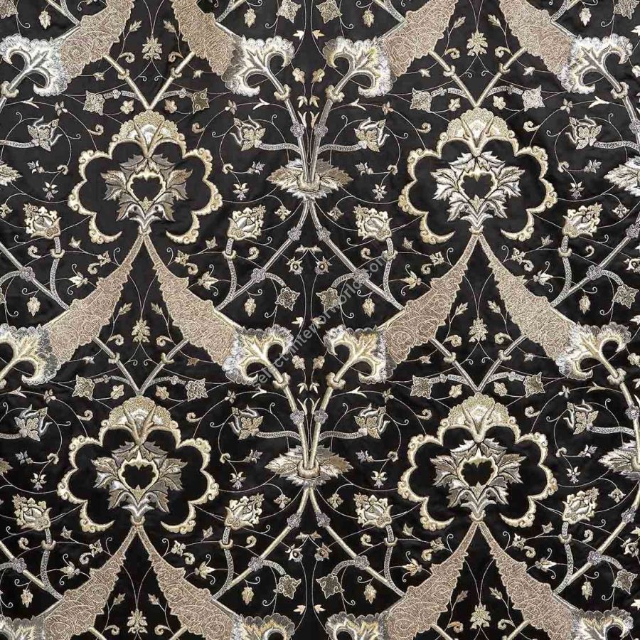 This richly detailed design is influenced by complex patterns from 17th century Ottoman tapestries. The large scale stylized motifs are highlighted using a variety of techniques and metallic threads.