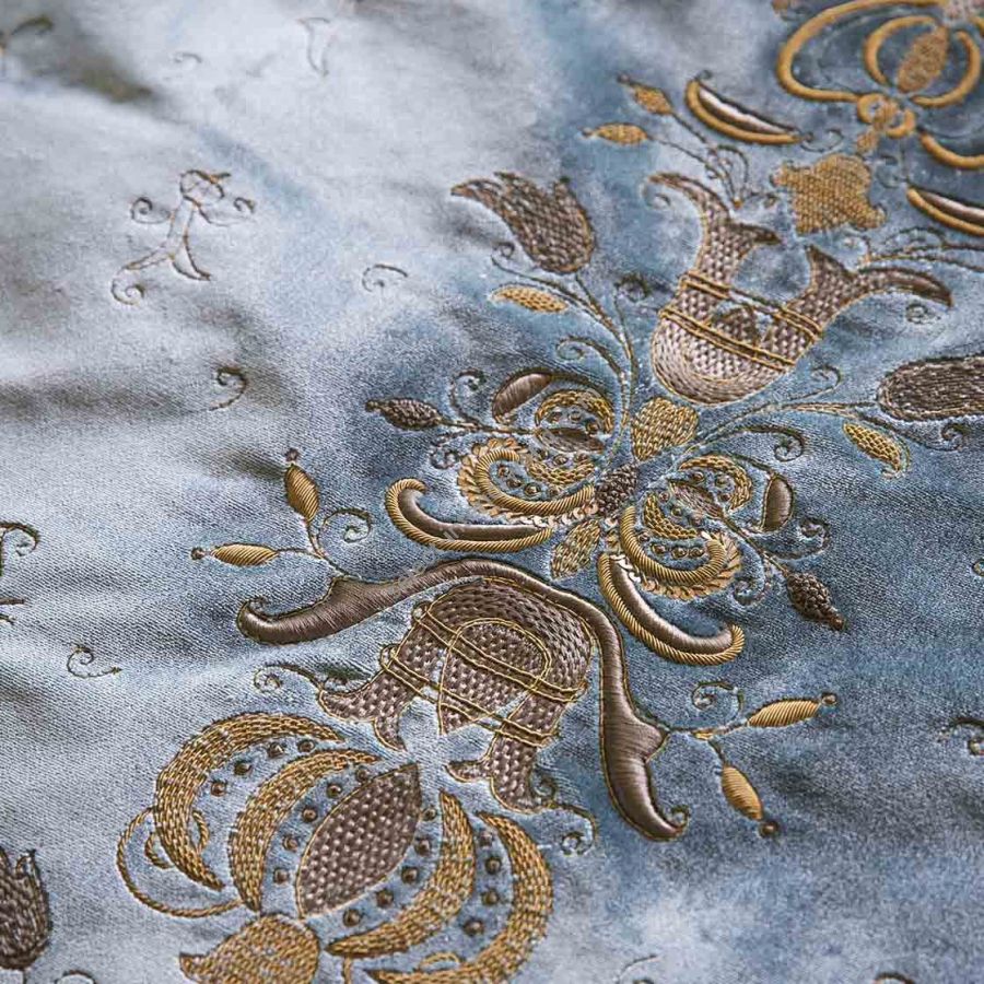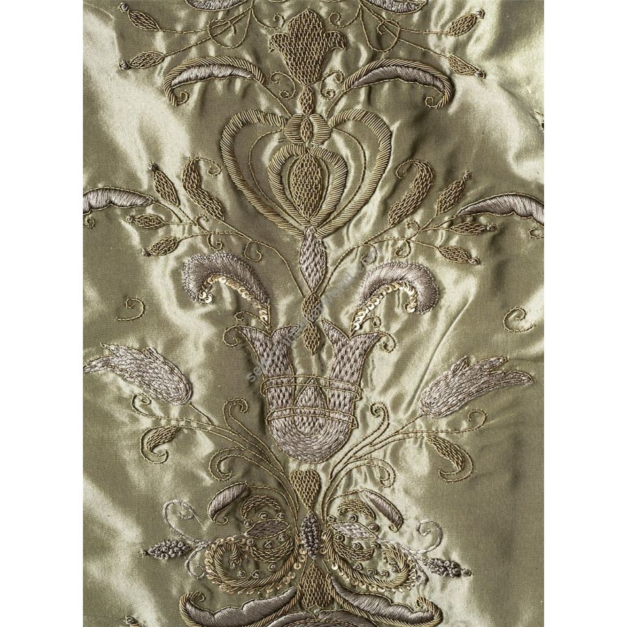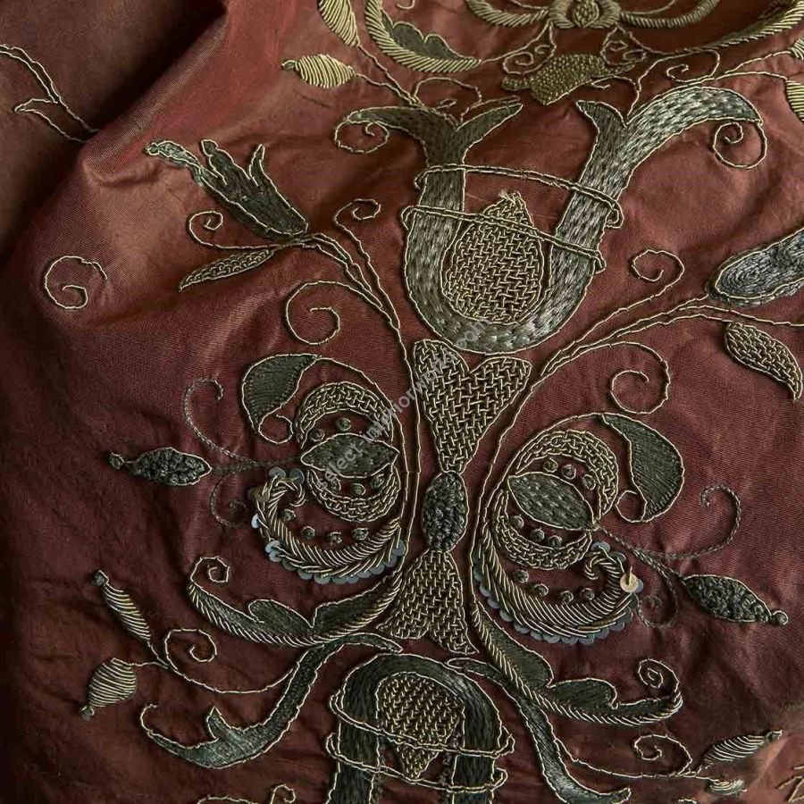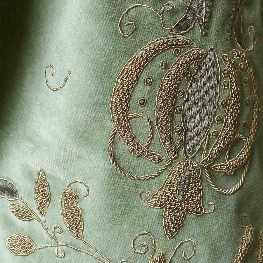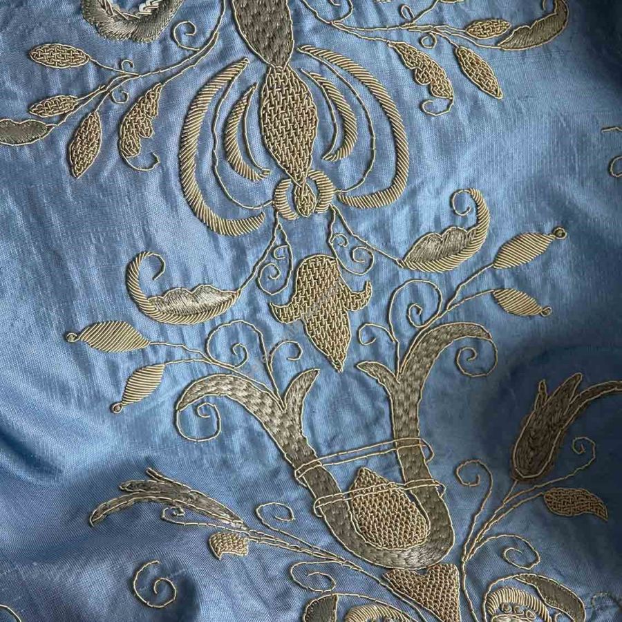 Our Couture fabrics are bespoke and hand embroidered to order. They can be created in fine gold or silver silk thread and embellished with freshwater pearls and semi-precious stones. Each pattern can be coloured and designed to fit your needs. We can embroider onto any background fabric including: silk, velvet, organza and leather